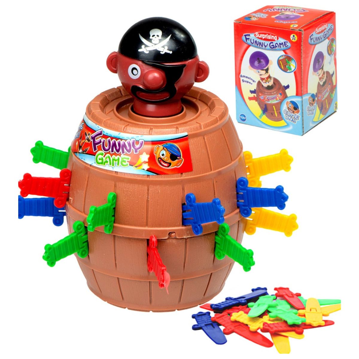 Arkadinis stalo žaidimas „Pašėlęs piratas“ – tai smagus šeimos žaidimas, kuriame kiekvienas žaidėjas atsargiai smeigia kardelius į statinę, stengdamasis neiššauti pirato.