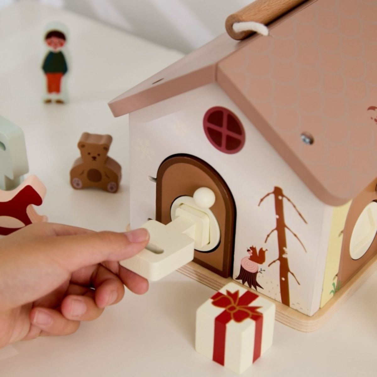 Medinis sensorinis namelis „Atrakink spyną“ – tai lavinamasis žaislas, kviečiantis vaiką tyrinėti, atrakinti ir atrasti.