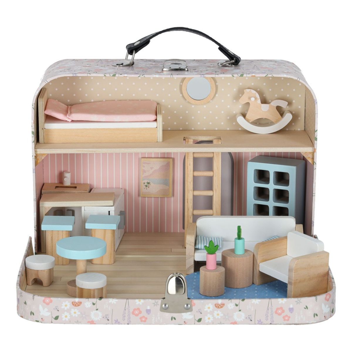 Lėlių namelis lagamine su mediniais baldais ir aksesuarais (25 det.) – tai kompaktiškas, išskleidžiamas žaidimų namelis, paslėptas stilingame lagamine.