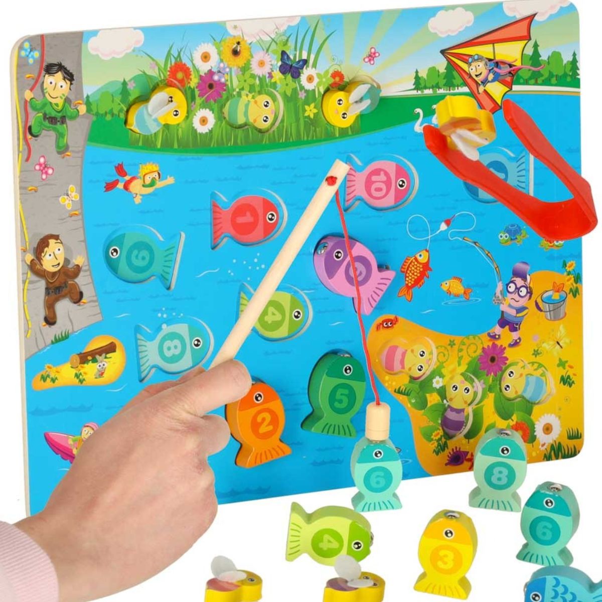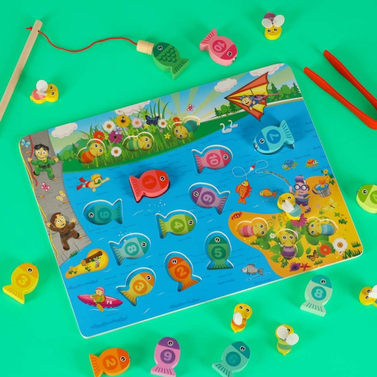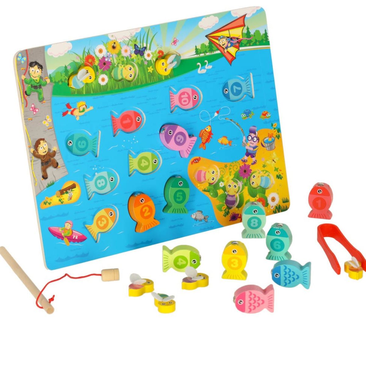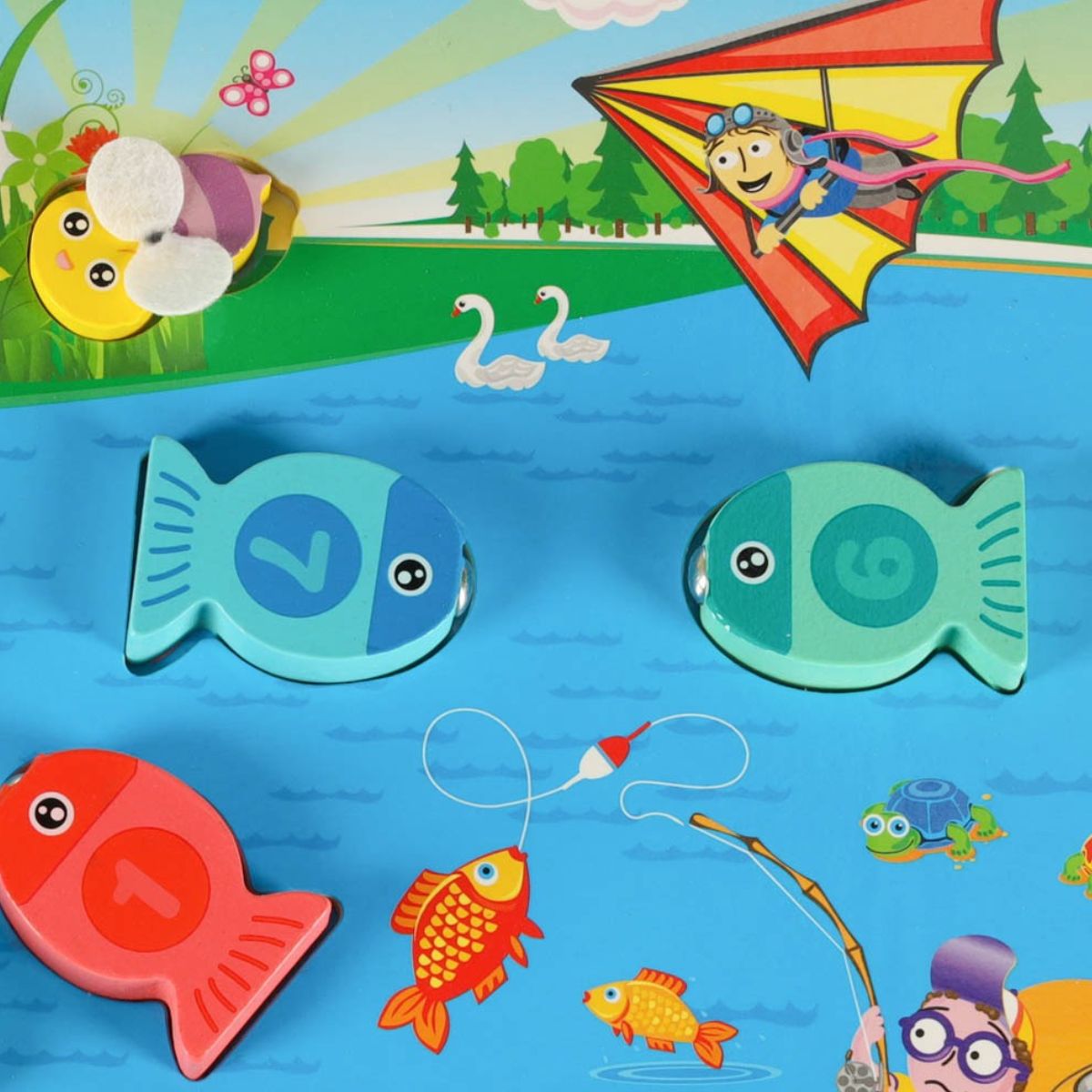 Medinis magnetinis žvejybos žaidimas „Poilsis prie ežero“ – tai edukacinis žaislas, kuriame vaikai gali gaudyti magnetines žuvis ir atlikti įvairias lavinamąsias užduotis.