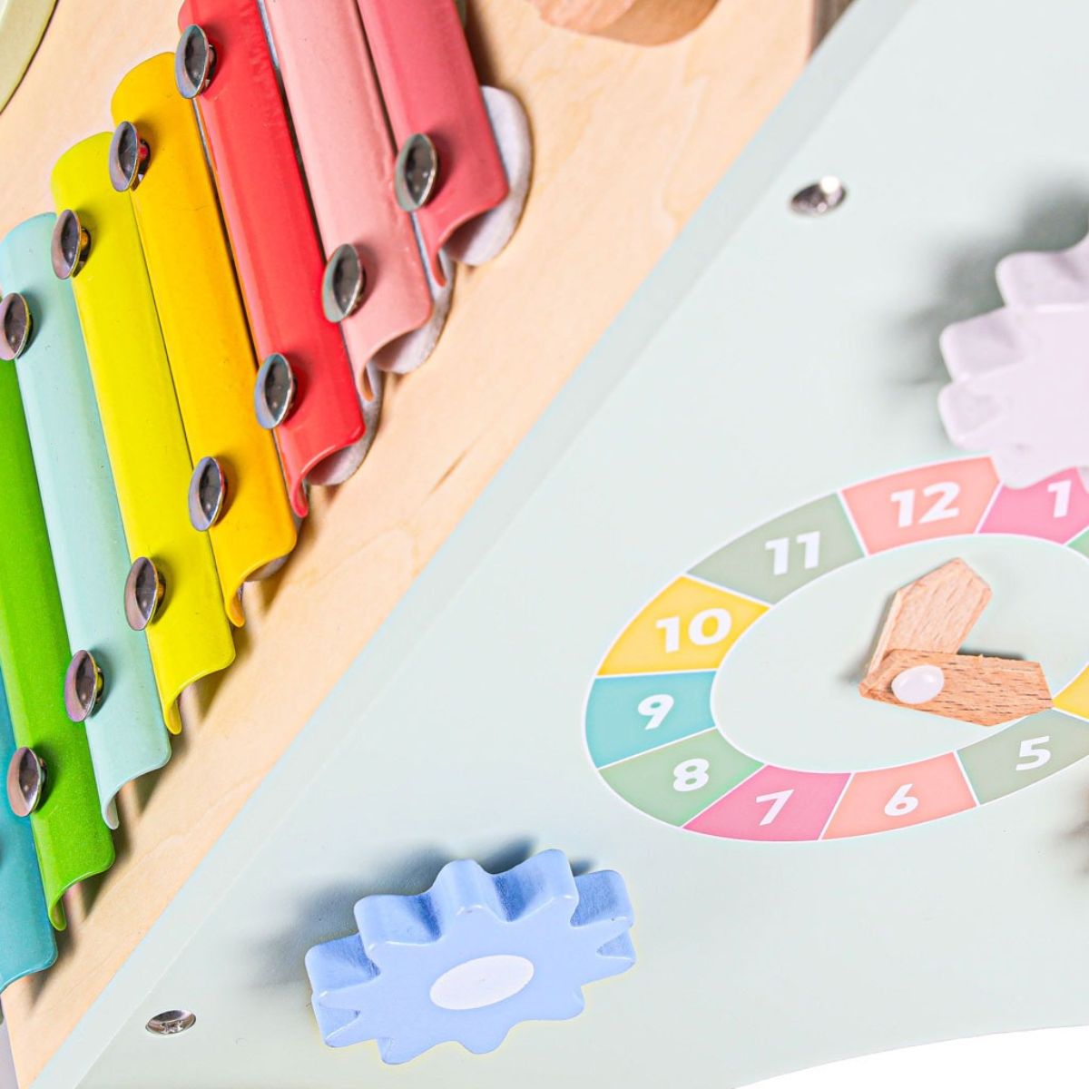 Formų rūšiuoklė su spalvotomis formomis moko atpažinti formas ir spalvas bei lavina smulkiąją motoriką. Muzikinis elementas – ksilofonas supažindina vaiką su garsais ir ritmu.