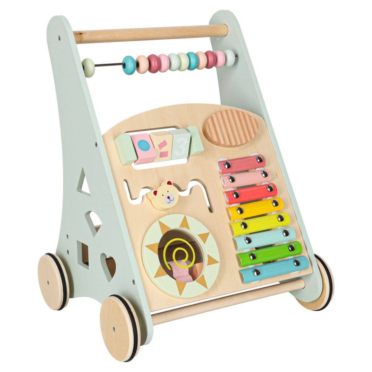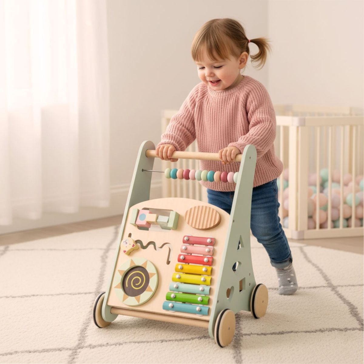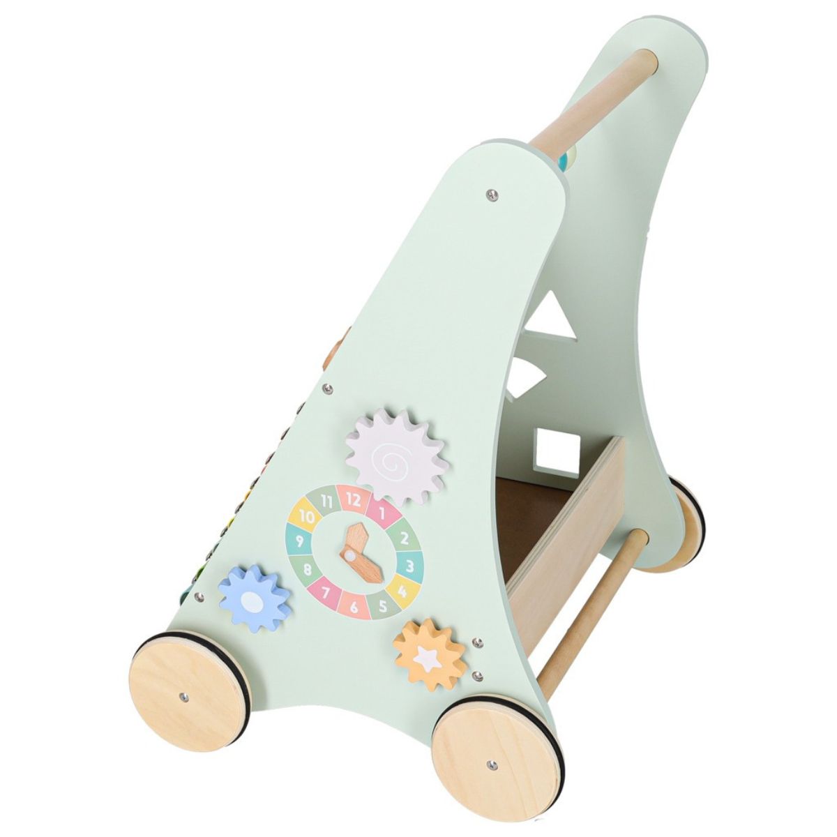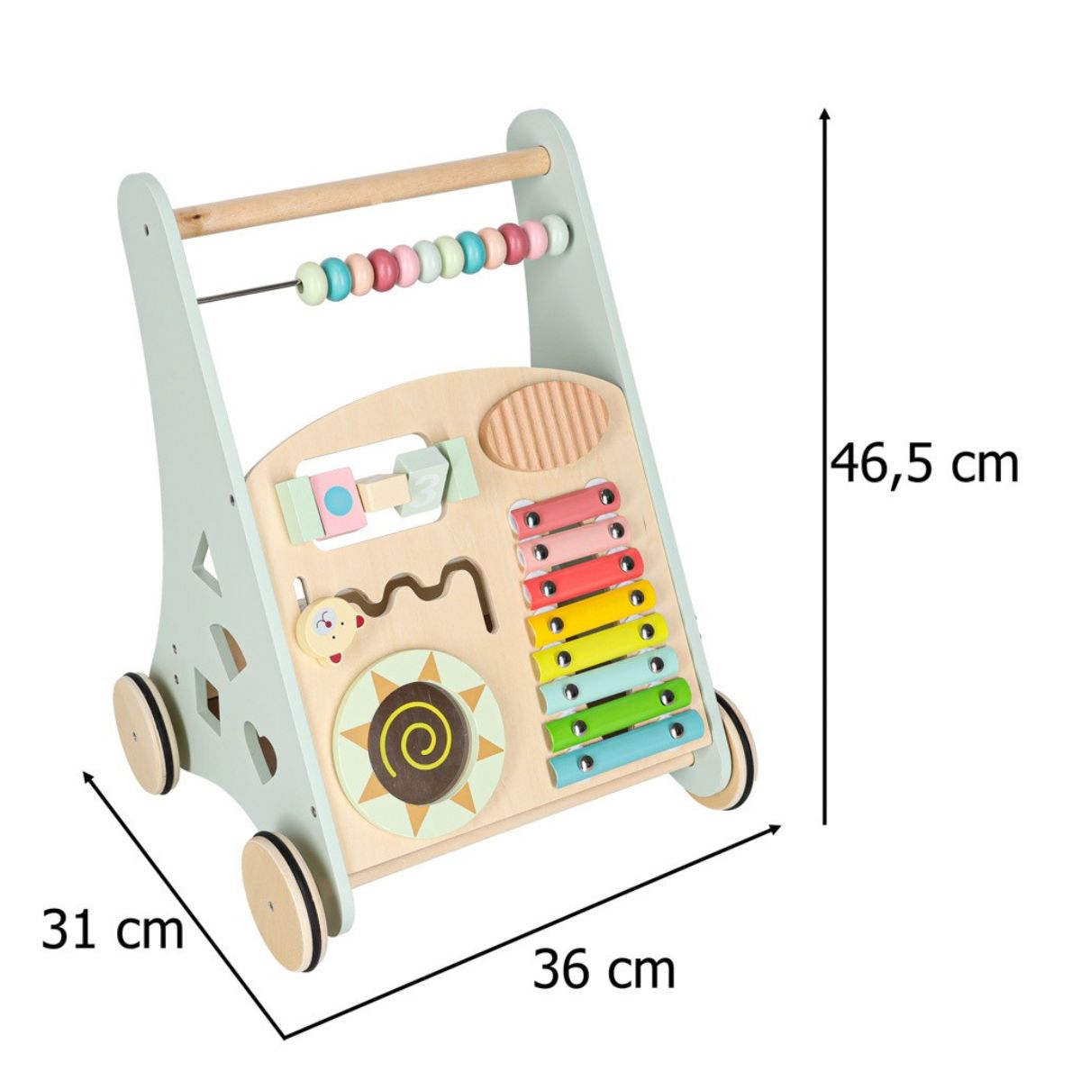 Tvirta medinė konstrukcija suteikia stabilumo, todėl vaikas gali drąsiai stumti stumduką ir žengti pirmuosius žingsnius.