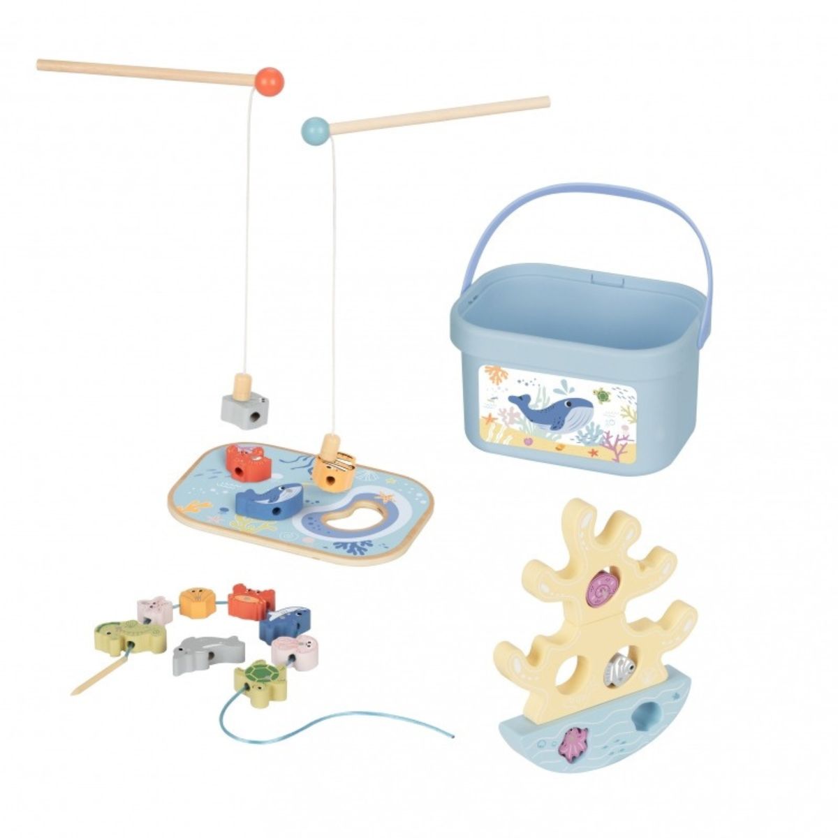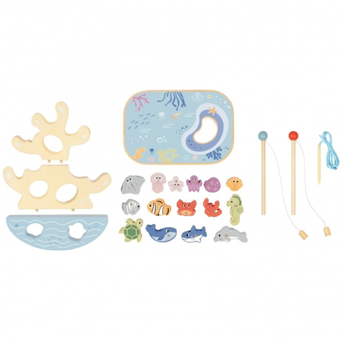 Viename rinkinyje sudėtos kelios skirtingos veiklos, kurios leidžia žvejoti magnetine meškere, dėlioti balansavimo rifą ir verti jūros gyvūnus ant virvelės.