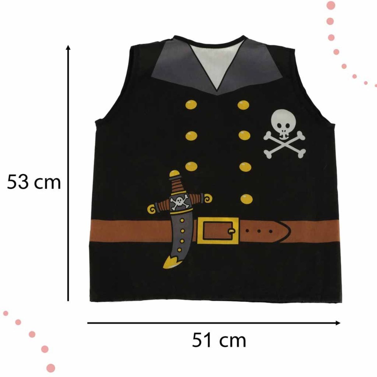 Kostiumą sudaro lengva liemenė su piratiškais motyvais, ryški galvos skarelė ir klasikinis akių raištis, leidžiantys vaikui įsijausti į pirato vaidmenį.