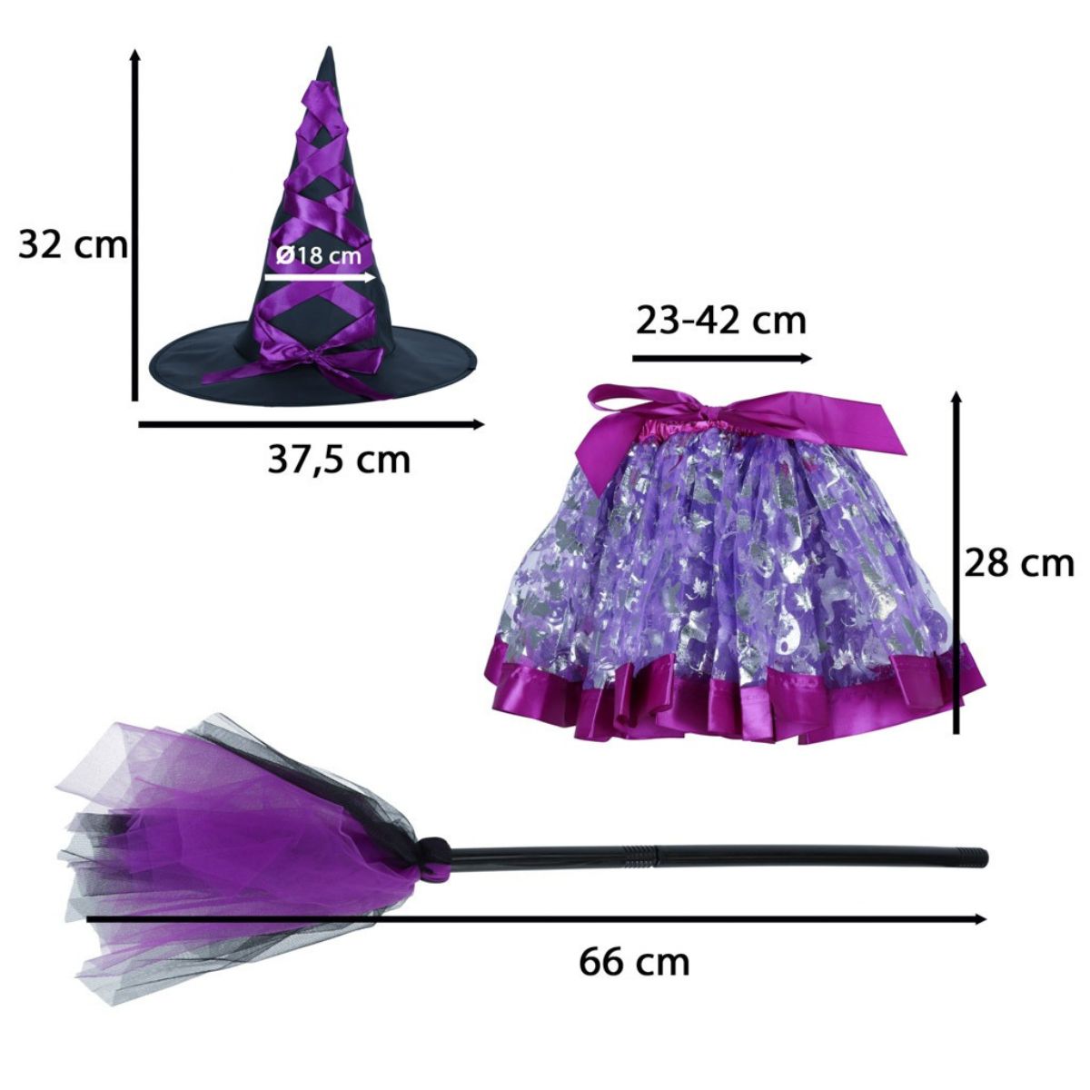 Vaikiškas raganos kostiumas su priedais ir tiulio sijonu skirtas karnavalams, darželiams, vaidmenų žaidimams ir teminėms šventėms kai vaikas įsikūnija į raganos vaidmenį šventėse ar namuose.