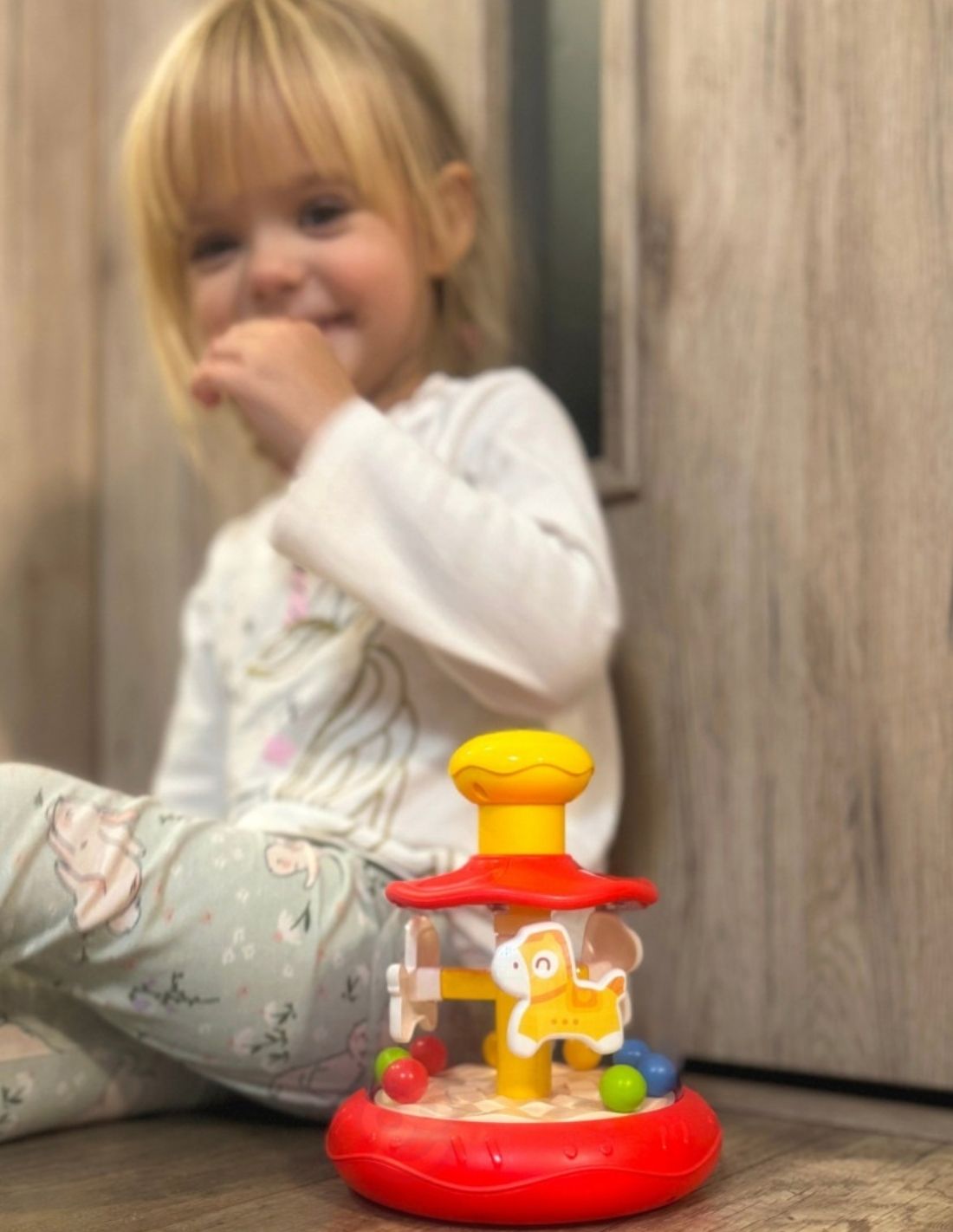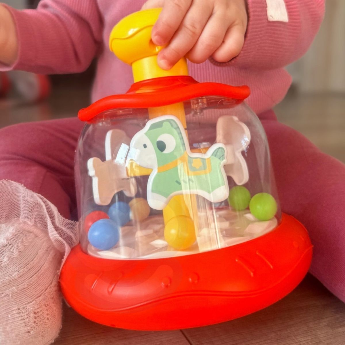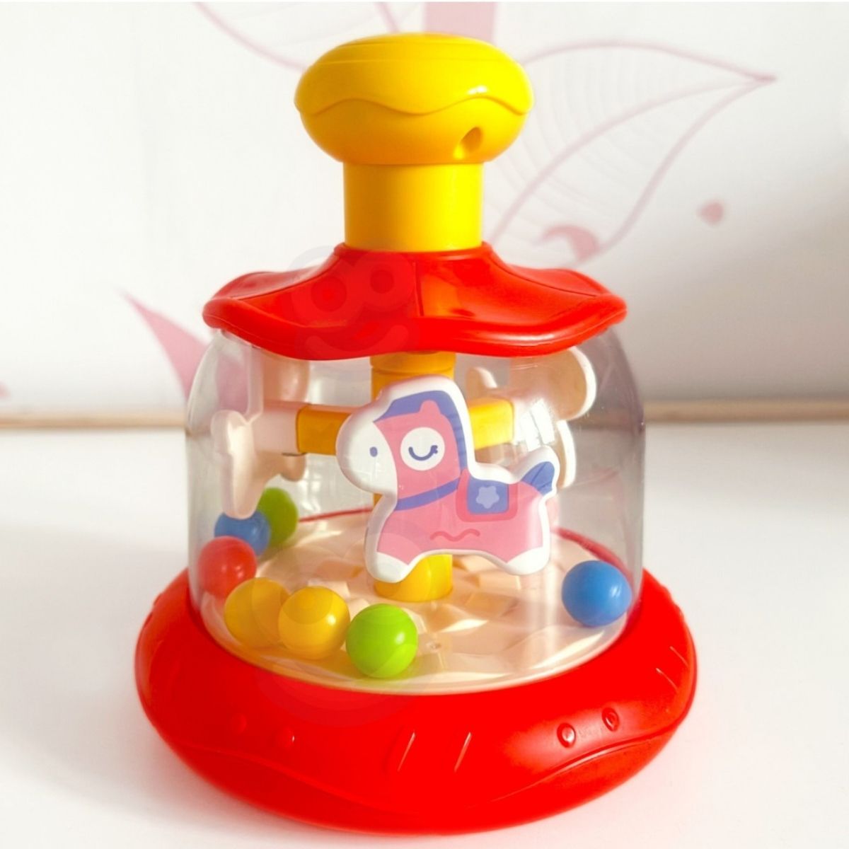 Paspaudus viršutinę geltoną rankenėlę, karuselės viduje pradeda suktis arkliukai ir spalvoti kamuoliukai, sukurdami judėjimą, kuris pritraukia vaiko dėmesį.