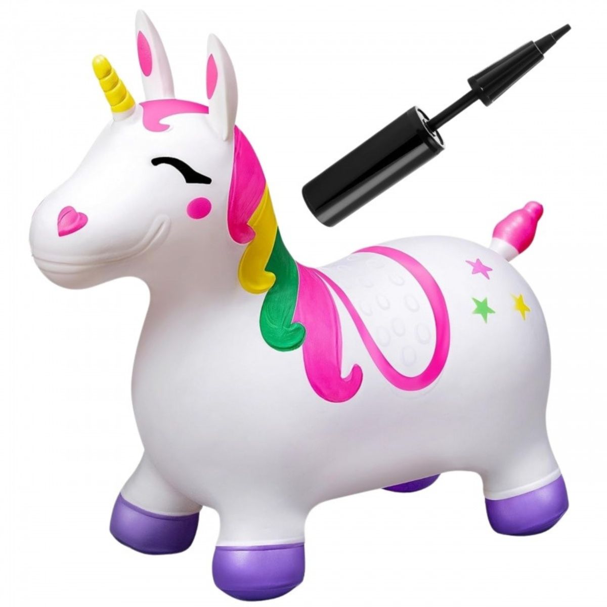 Plati keturių kojų pagrindo konstrukcija užtikrina stabilumą, o ergonomiškos vienaragio ausys tarnauja kaip patogūs laikikliai mažoms rankoms. Pridedama pompa leidžia greitai paruošti žaislą naudojimui.