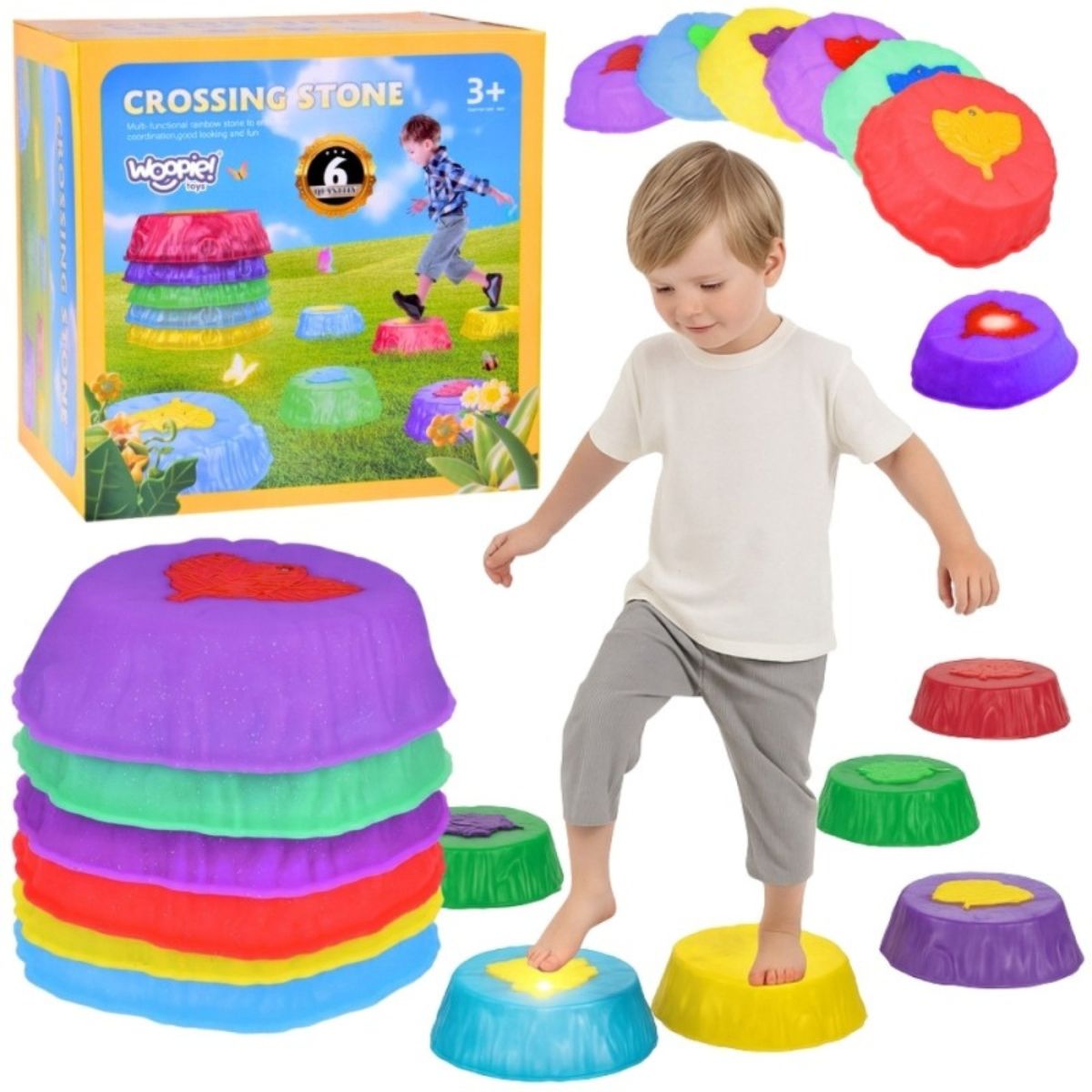 Rinkinį sudaro 6 spalvingi akmenys, kurie skatina vaiką lipti, žengti, šokinėti ir išlaikyti pusiausvyrą.