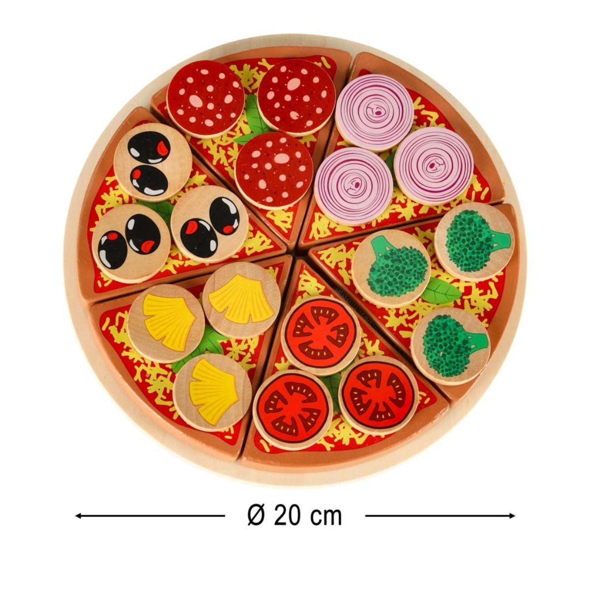 Žaislinė medinė pica su pjaustymo priedais, 20cm