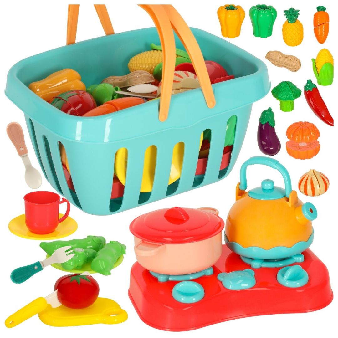 Krepšelis leidžia patogiai laikyti ir pernešti visus elementus, o žaislinė viryklė, puodas, arbatinukas ir indai suteikia galimybę kurti įvairius maisto gaminimo scenarijus.
