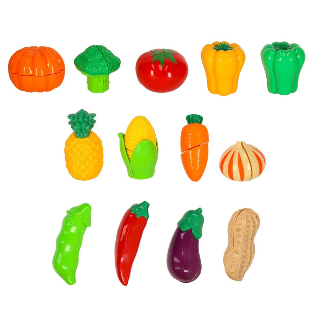 Žaislinis daržovių ir vaisių rinkinys su krepšeliu ir priedais skirtas vaidmenų žaidimams, kuriuose vaikas imituoja maisto ruošimą ir kasdienes virtuvės situacijas.