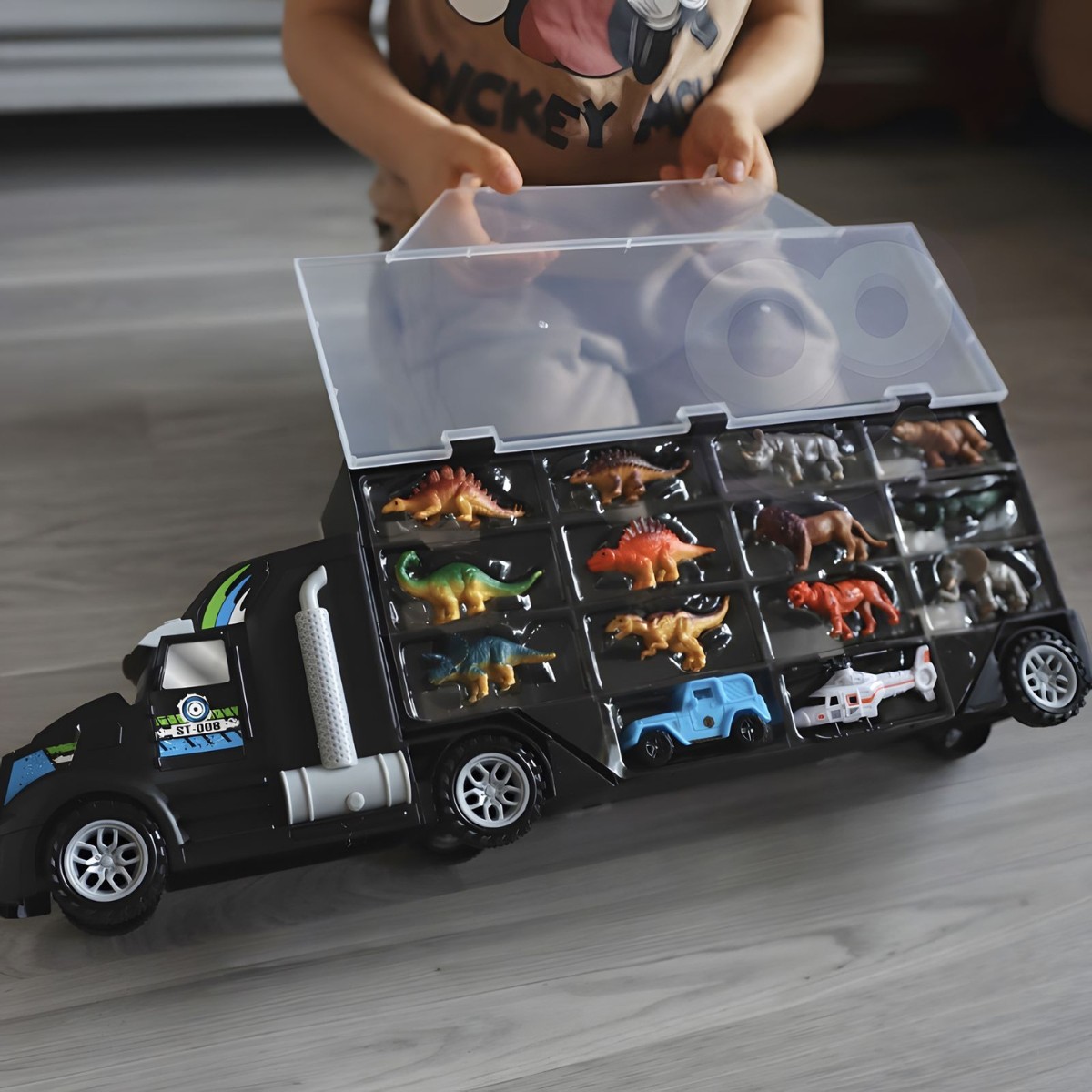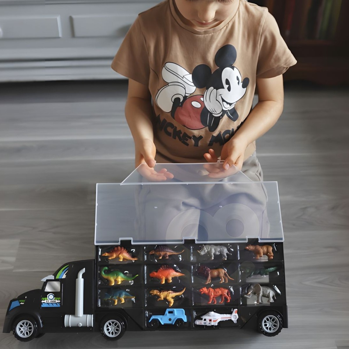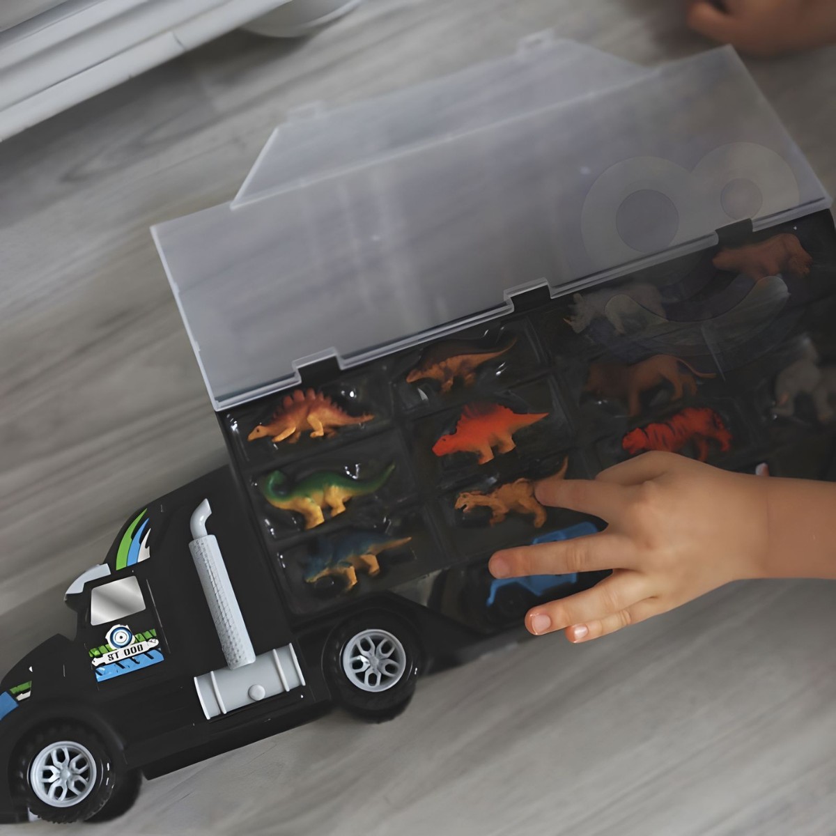 Automobilių transporteris – sunkvežimis „Dinozaurai“ iš Woopie – tai daugiafunkcis žaidimų rinkinys, kuris vienu metu yra ir sunkvežimis, ir žaislų dėžė bei transporto priemonių paleidimo rampa. Didelis, net 50 cm ilgio sunkvežimis atsidaro iš abiejų pusių, o viduje yra 24 vietos sudėti dinozaurams, mažoms mašinėlėms. Tai padeda vaikui palaikyti tvarką ir visus žaislus laikyti vienoje vietoje.