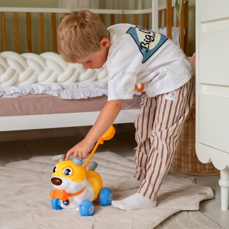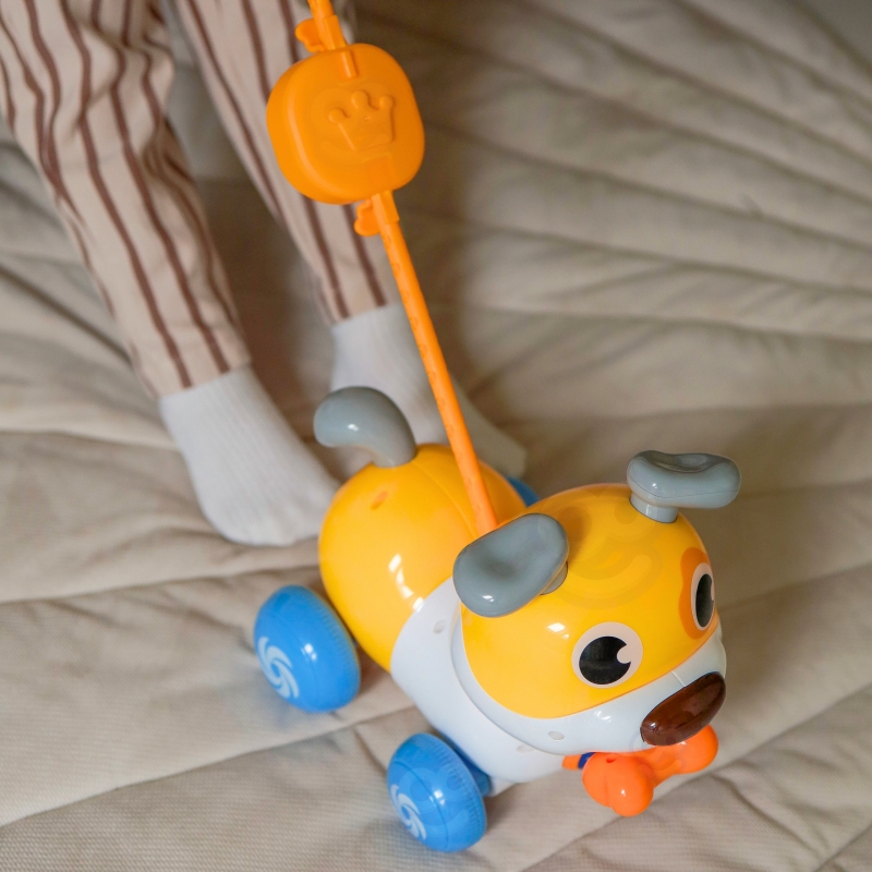 Interaktyvus stumdukas su rankenėle „Lojantis šuniukas“ – tai žaislas, skatinantis vaiką judėti, tyrinėti ir aktyviai žaisti. Stumiamas šuniukas juda ant ratukų ir reaguoja į vaiko veiksmus, todėl žaidimas tampa įtraukiantis ir smagus.