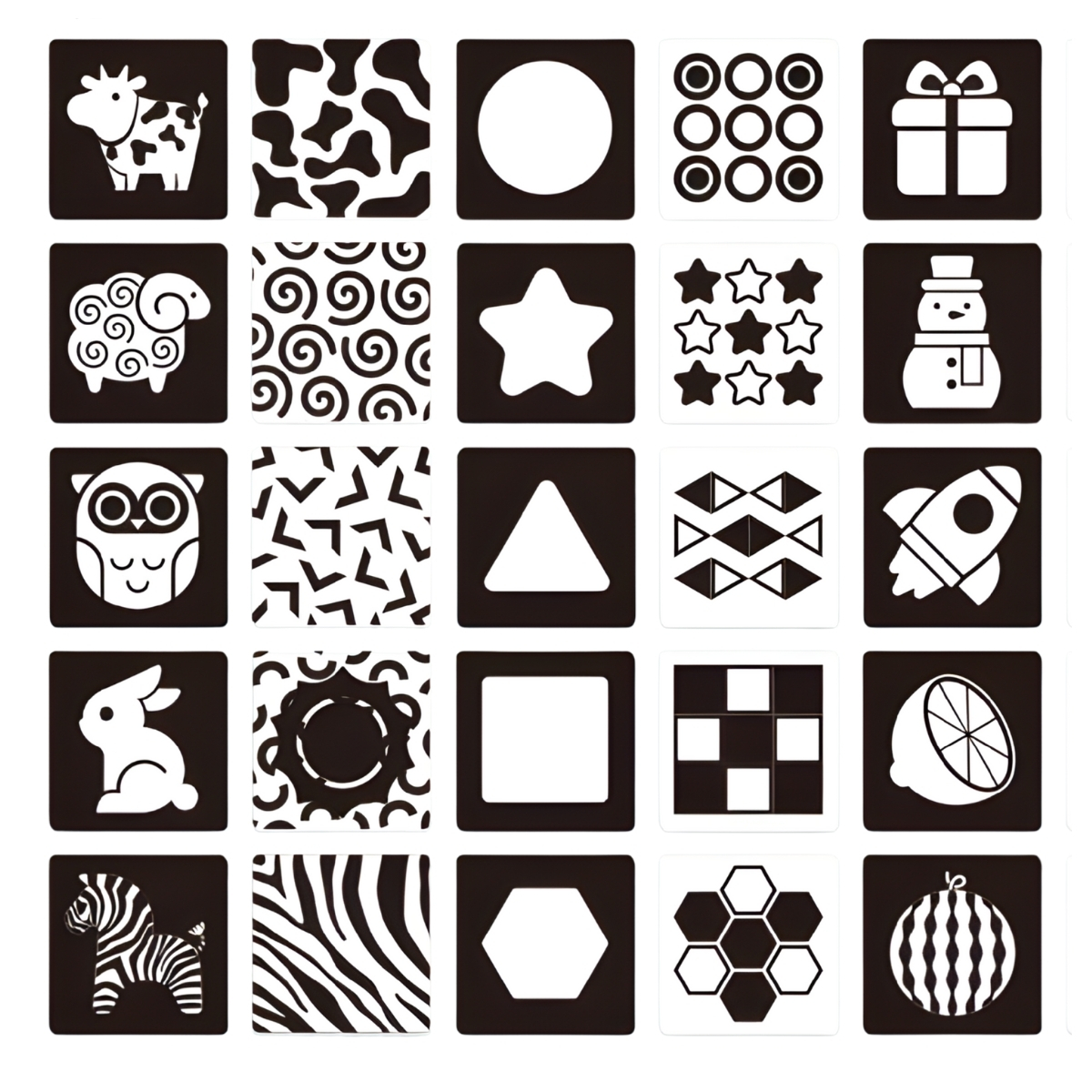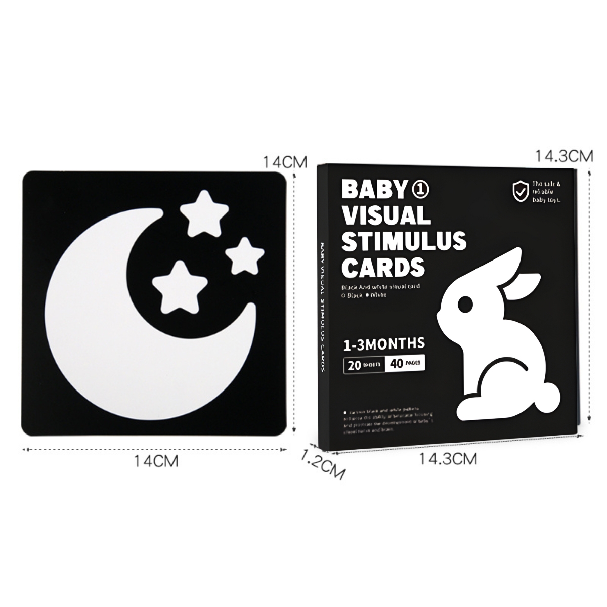 Vizualinės kontrastinės kortelės padeda natūraliai lavinti kūdikio regėjimą ir smalsumą nuo pat pirmųjų gyvenimo dienų. Ką tik gimę kūdikiai aiškiausiai mato juodos ir baltos spalvų kontrastus, todėl paprasti, ryškūs vaizdai leidžia lengviau sutelkti žvilgsnį, sekti objektus ir gerinti ankstyvojo regėjimo vystymąsi.
