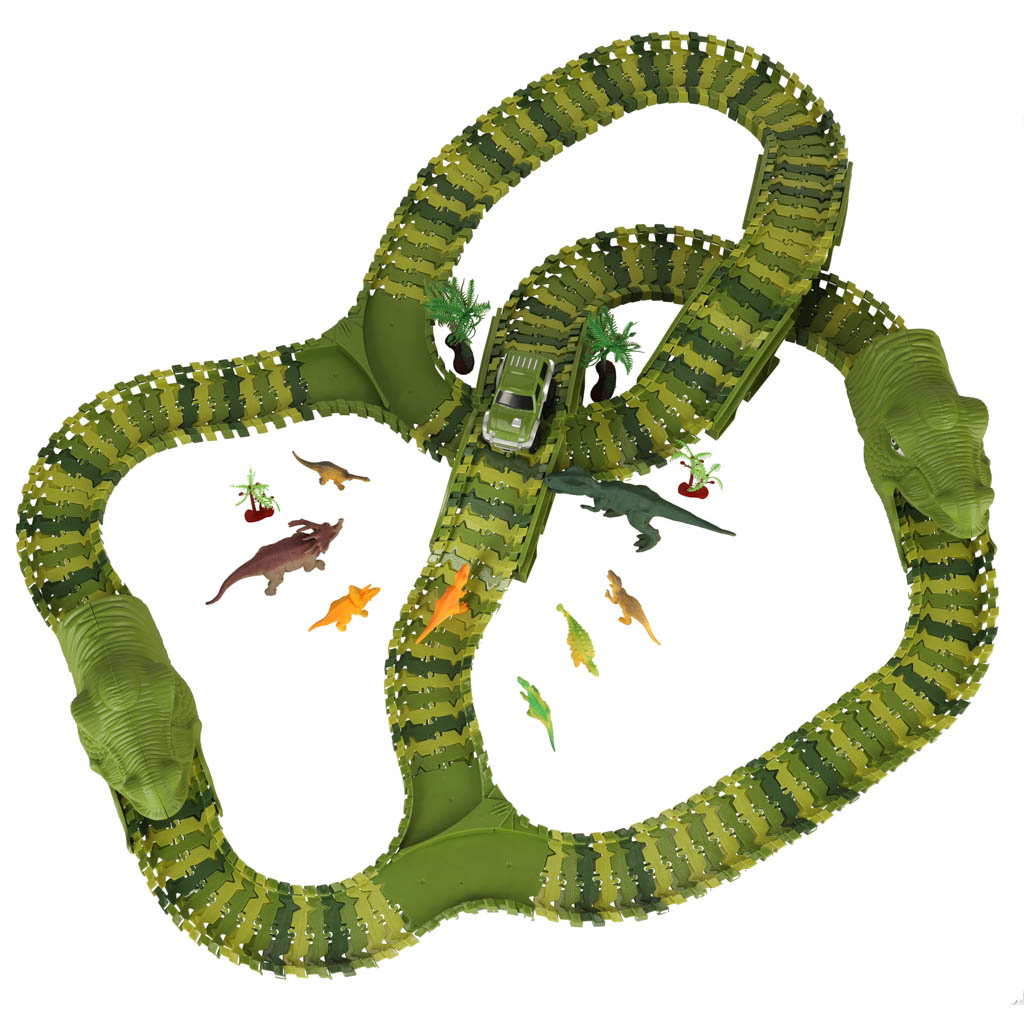 Lenktynių trasa „Dinozaurai“ – įspūdingas rinkinys mažiesiems greičio ir dinozaurų gerbėjams. Vaikas gali sukurti savo kelią per džiungles, pilnas dinozaurų ir kliūčių. Trasa lanksti, todėl ją galima statyti įvairiais būdais – kūrybiškumui ribų nėra!