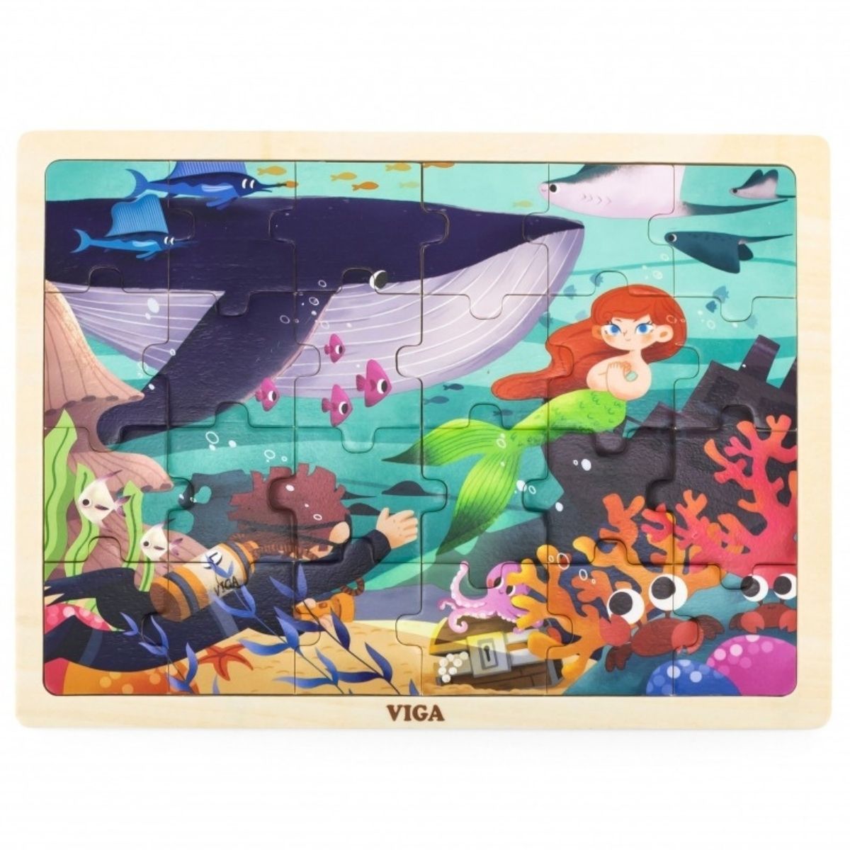 VIGA medinė dėlionė „Jūros paslaptys“ – lavinamoji dėlionė su ryškiais jūrų pasaulio motyvais. Visos detalės dėliojamos į medinę pagrindo lentelę, kurioje matomas pilnas paveikslėlis – tai padeda vaikui atpažinti detales ir lengviau surinkti visą kompoziciją.