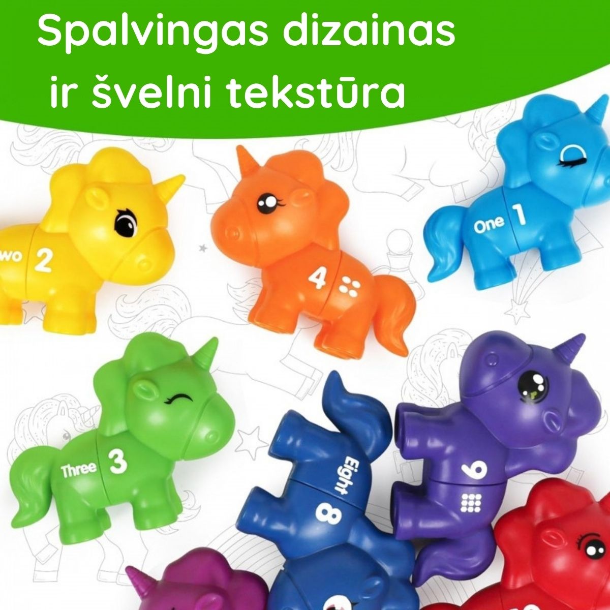 Montessori edukacinis skaičių ir spalvų rinkinys – tai spalvingas ir žaismingas lavinamasis rinkinys, kviečiantis vaikus mokytis per kūrybišką žaidimą. Žaisdami vaikai jungia vienaragių dalis tarpusavyje, derindami jas pagal skaičius, spalvas ar formas.