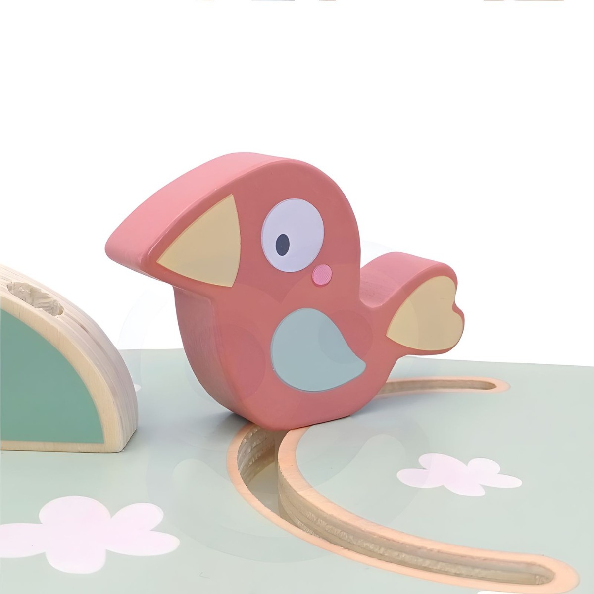 Pagamintas iš aukštos kokybės FSC sertifikuoto medžio ir tvirto plastiko, nudažytas netoksiškais, vaikams saugiais dažais. Pastelinės spalvos ir apvalintos formos suteikia žaislui estetikos ir saugumo.