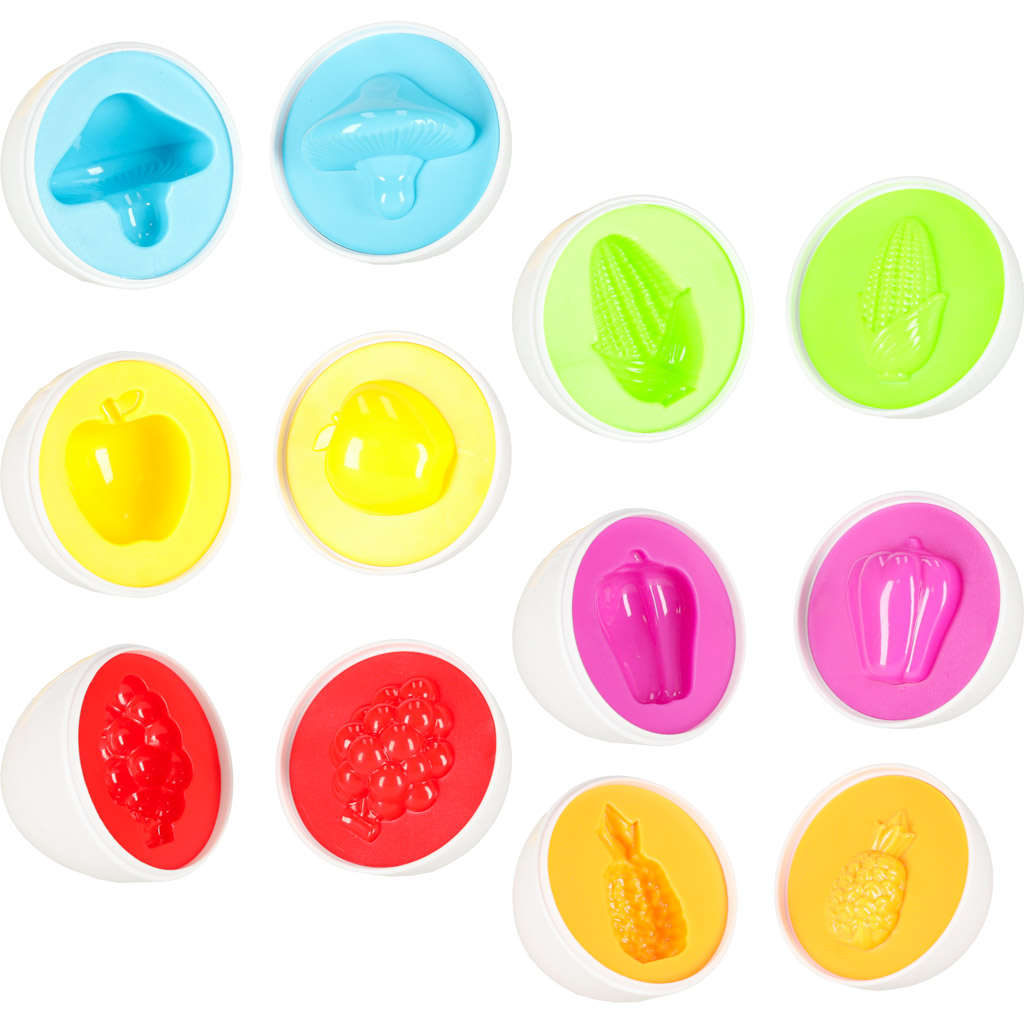 – 6 edukaciniai kiaušiniai su vaisių ir daržovių formomis