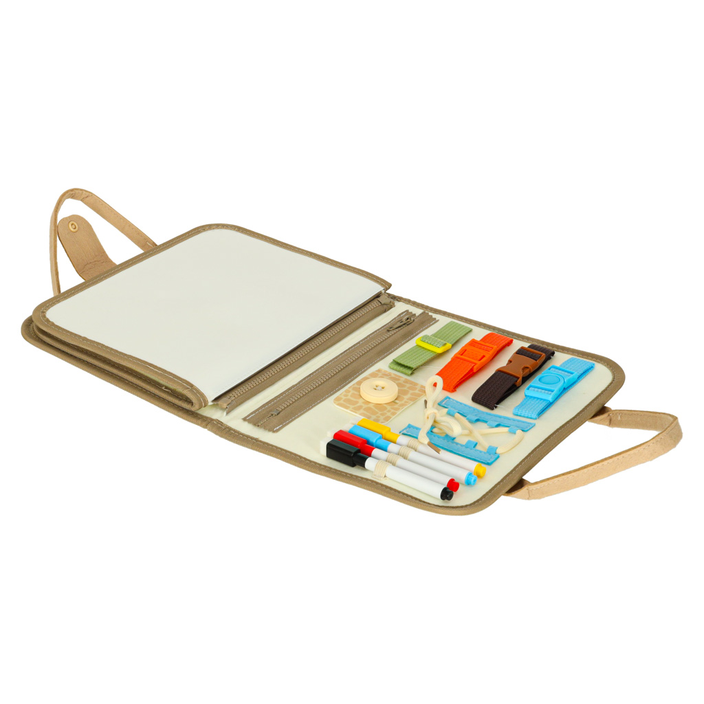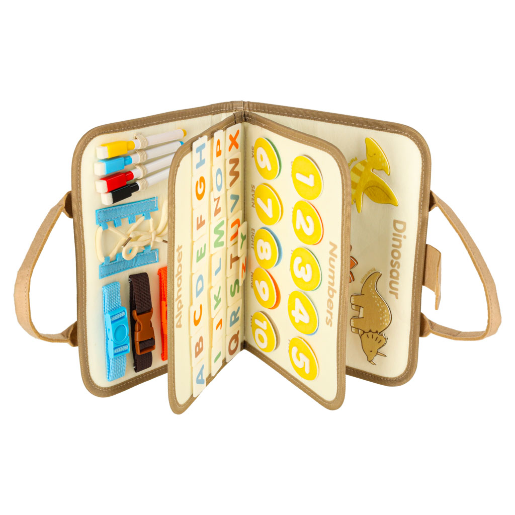 Montessori užimtumo penalas „Dinozaurai“ – tai kompaktiška ir vaikams draugiška užimtumo knygelė-lagaminas, sukurta lavinti mažųjų savarankiškumą, smulkiąją motoriką ir kasdienių įgūdžių praktiką. Iš minkšto filco pagaminta teczkės formos lenta turi daug motorinių užduočių (užsegimai, sagtelės, raišteliai, užtrauktukai), edukacinių veiklų (skaičiai, raidės, formos, dinozaurai) bei kūrybinę sausai nuvalomą lentą su 4 markeriais.