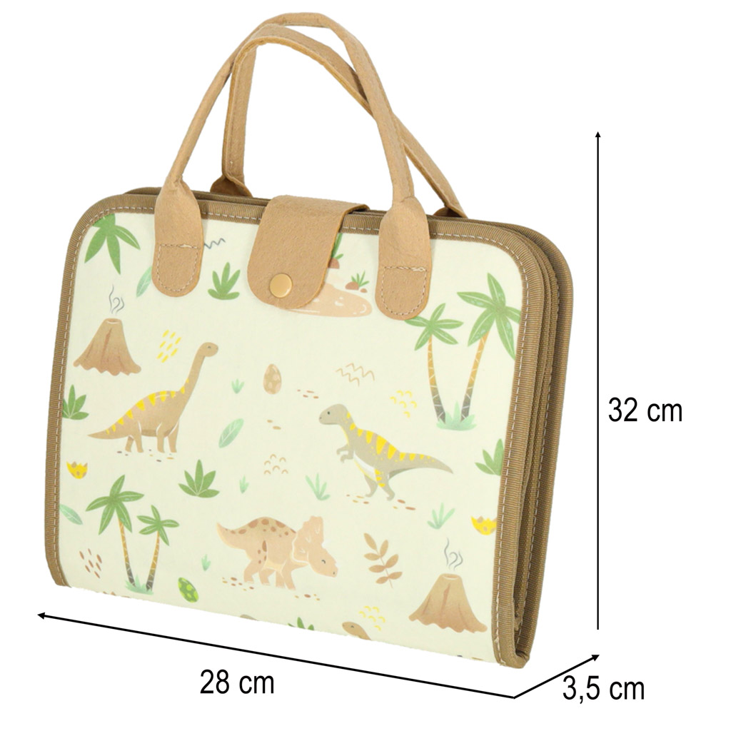 Penalas lengvas, patogus nešioti kaip mini lagaminėlį, todėl idealiai tinka kelionėms, laukimo situacijoms, pasivažinėjimams automobilyje ar ramioms veikloms namuose. Ryškūs, bet švelnūs pastelinių atspalvių dinozaurai įtraukia vaiką į žaidimą, o įvairios faktūros ir užduotys stiprina pirštukų miklumą, koordinaciją ir loginį mąstymą.