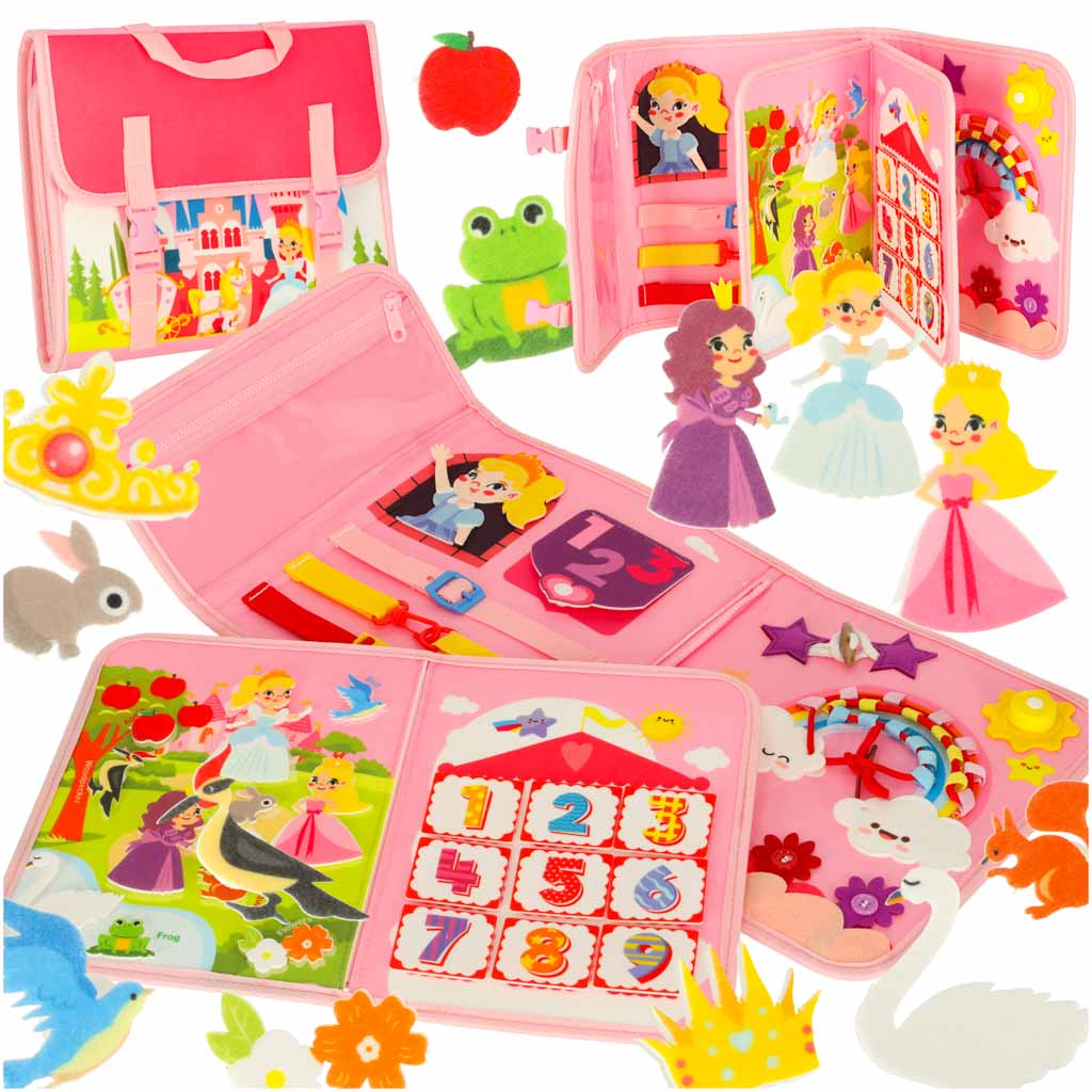 Žaisle yra daugybė interaktyvių veiklų: užtrauktukai, sagtelės, karabinai, sagos, raišteliai ir klijuojami elementai, kurie moko kasdienių įgūdžių – užsisegti drabužius, užrišti batukus ar atsegti dirželį. Kiti puslapiai su pasakų motyvais leidžia pažinti spalvas, formas, gyvūnus, princeses ir pilis, o kai kurie elementai turi angliškus užrašus – puikus būdas lavinti ir kalbos įgūdžius.