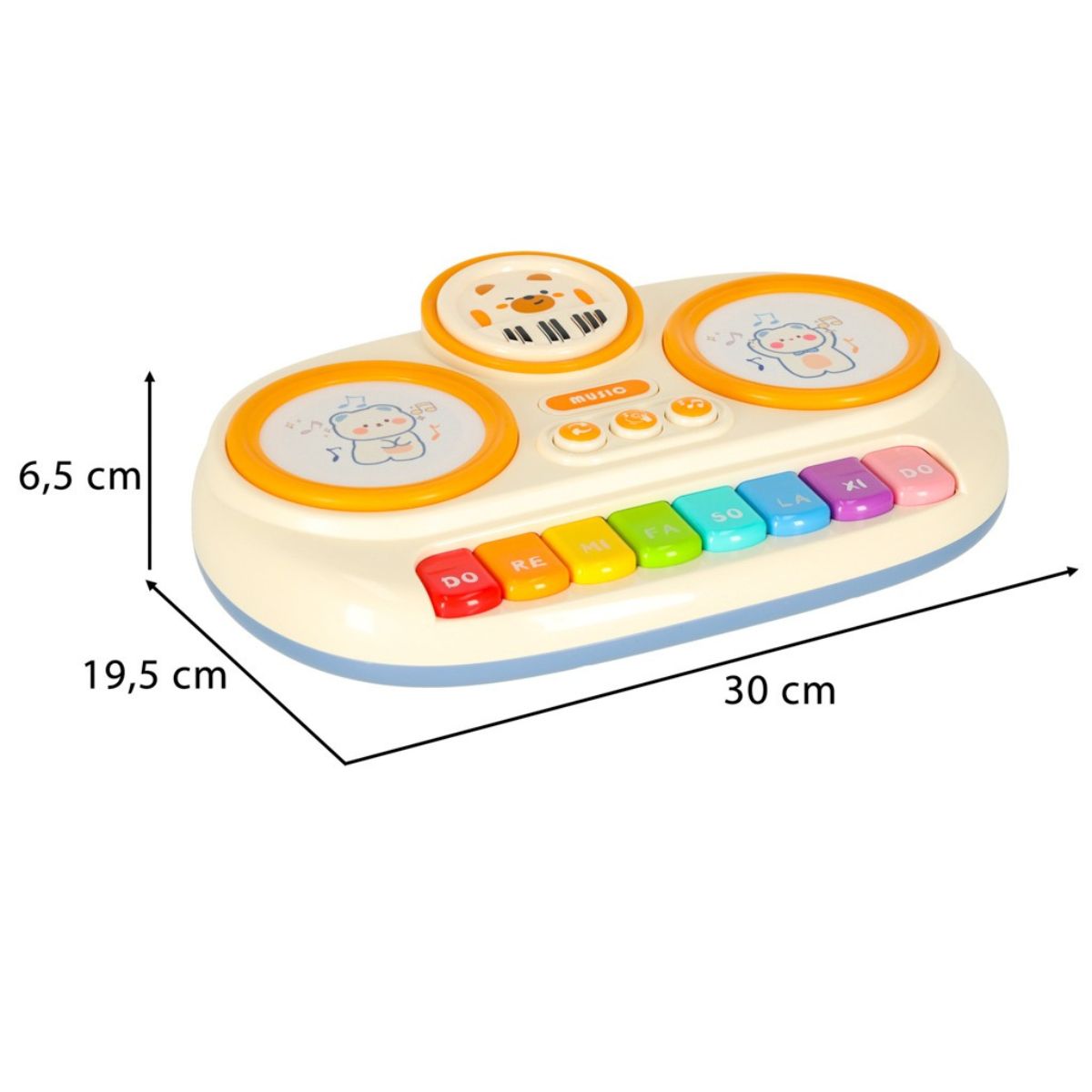Pianinas taip pat turi apvalius liečiamuosius padus, kurie skleidžia būgnų tipo garsus, suteikdami žaidimui daugiau įvairovės. Žaidžiant lavinama klausos percepcija, koordinacija ir kūrybinė saviraiška.