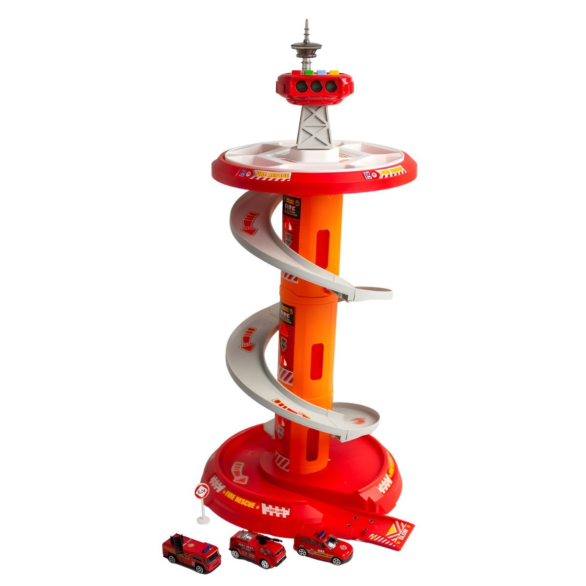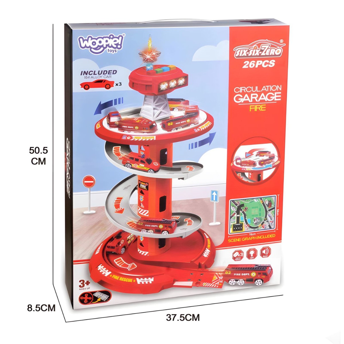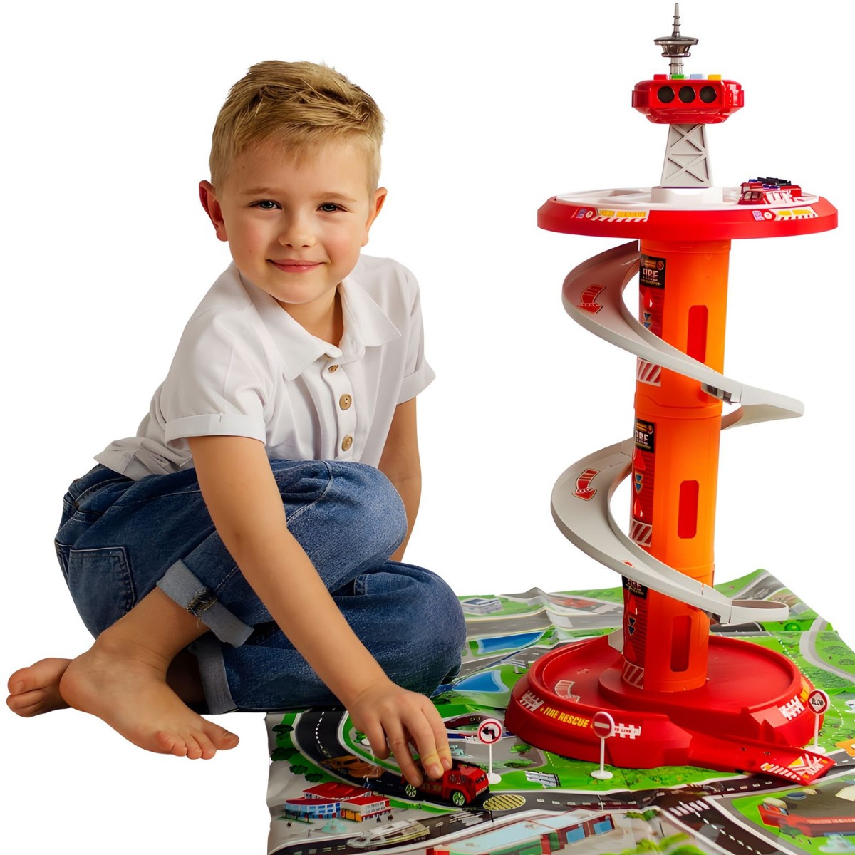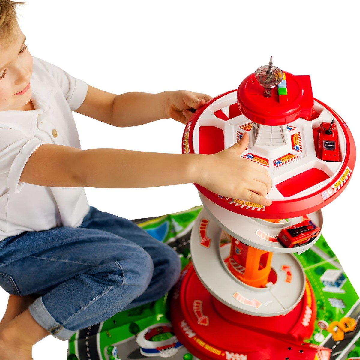 Rinkinyje yra 26 detalės, tarp jų – 3 skirtingi ugniagesių automobiliai, kelio ženklai ir spalvinga kelio kilimėlis. Specialus liftas ir vingiuoti nusileidimai leidžia automobiliams leistis nuo aukščiausio lygio iki išvažiavimo, o realistiški garsai ir mirksinčios šviesos suteikia žaidimui tikroviškumo.