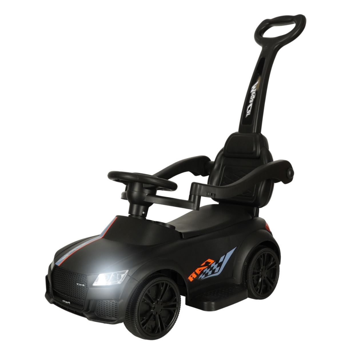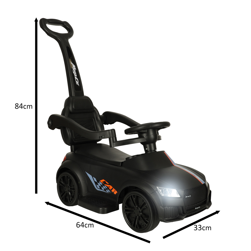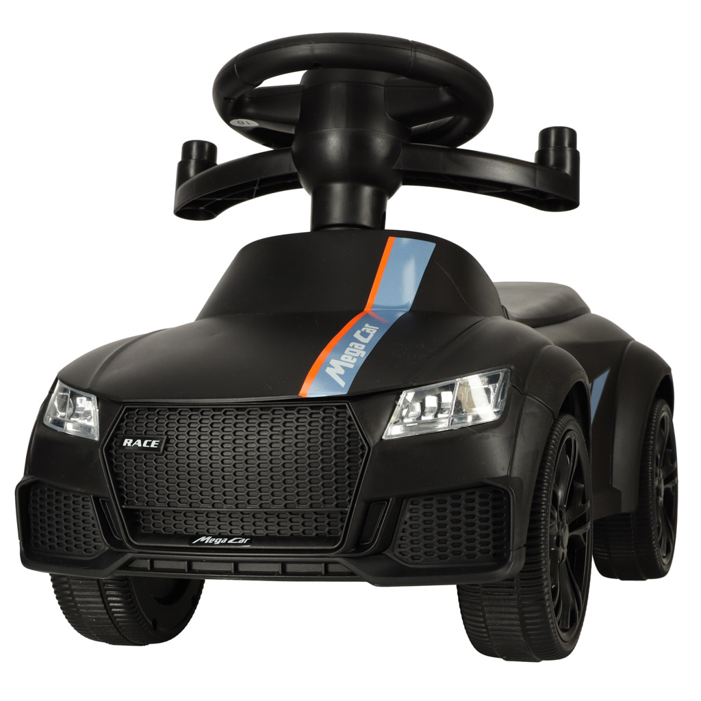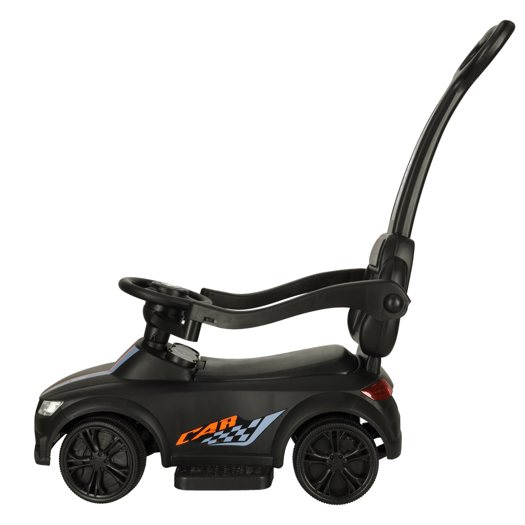 Juoda stumiama mašinėlė – idealus pirmasis automobilis mažiesiems nuo 12 mėnesių! Patogi sėdynė su atlošu ir apsauginėmis užtvaromis suteikia stabilumo, todėl vaikas gali saugiai važiuoti, kol tėvai stumia mašinėlę.