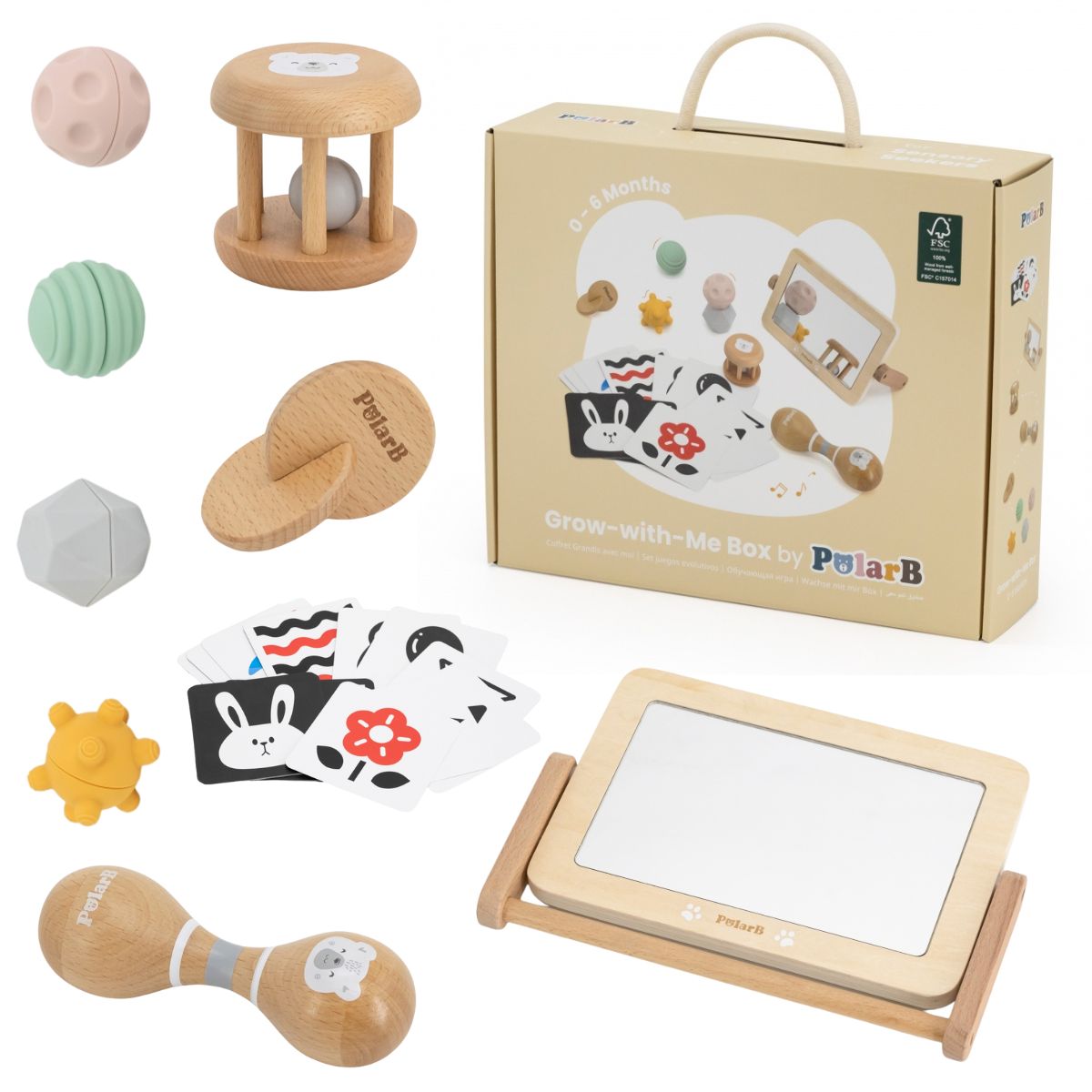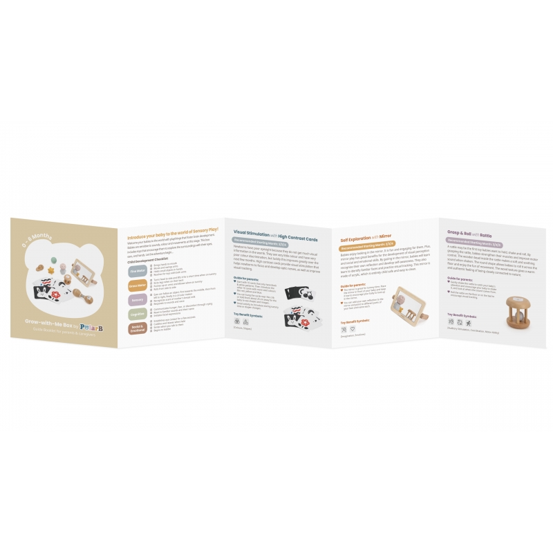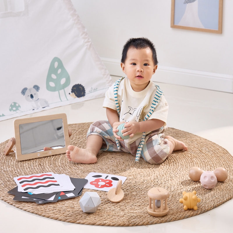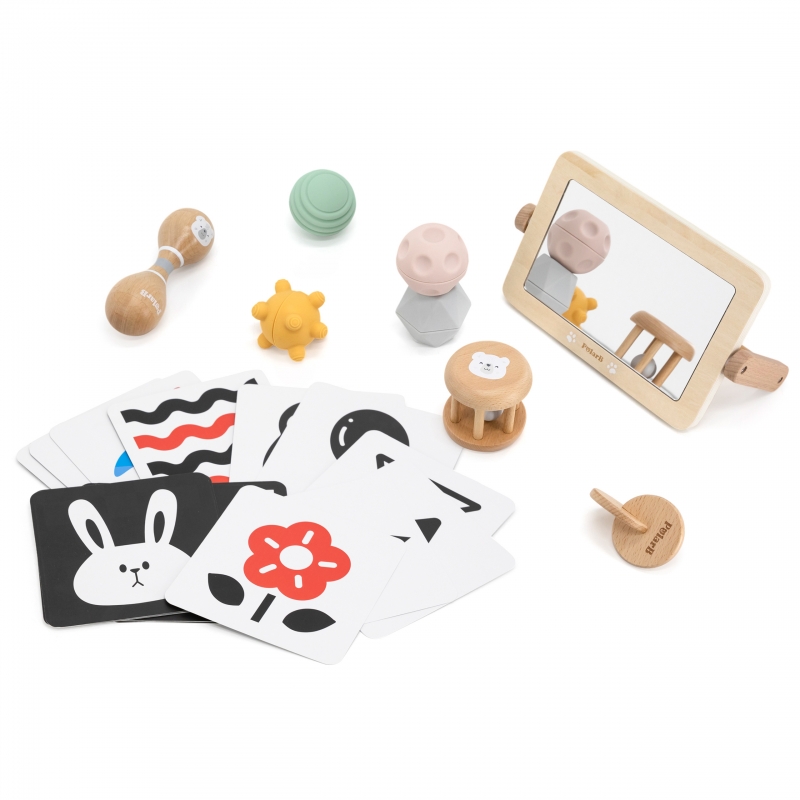 Rinkinyje esantys žaislai padeda skatinti regą, klausą ir lytėjimą, sudarydami sąlygas natūraliam vaiko tyrinėjimui nuo pirmųjų dienų.