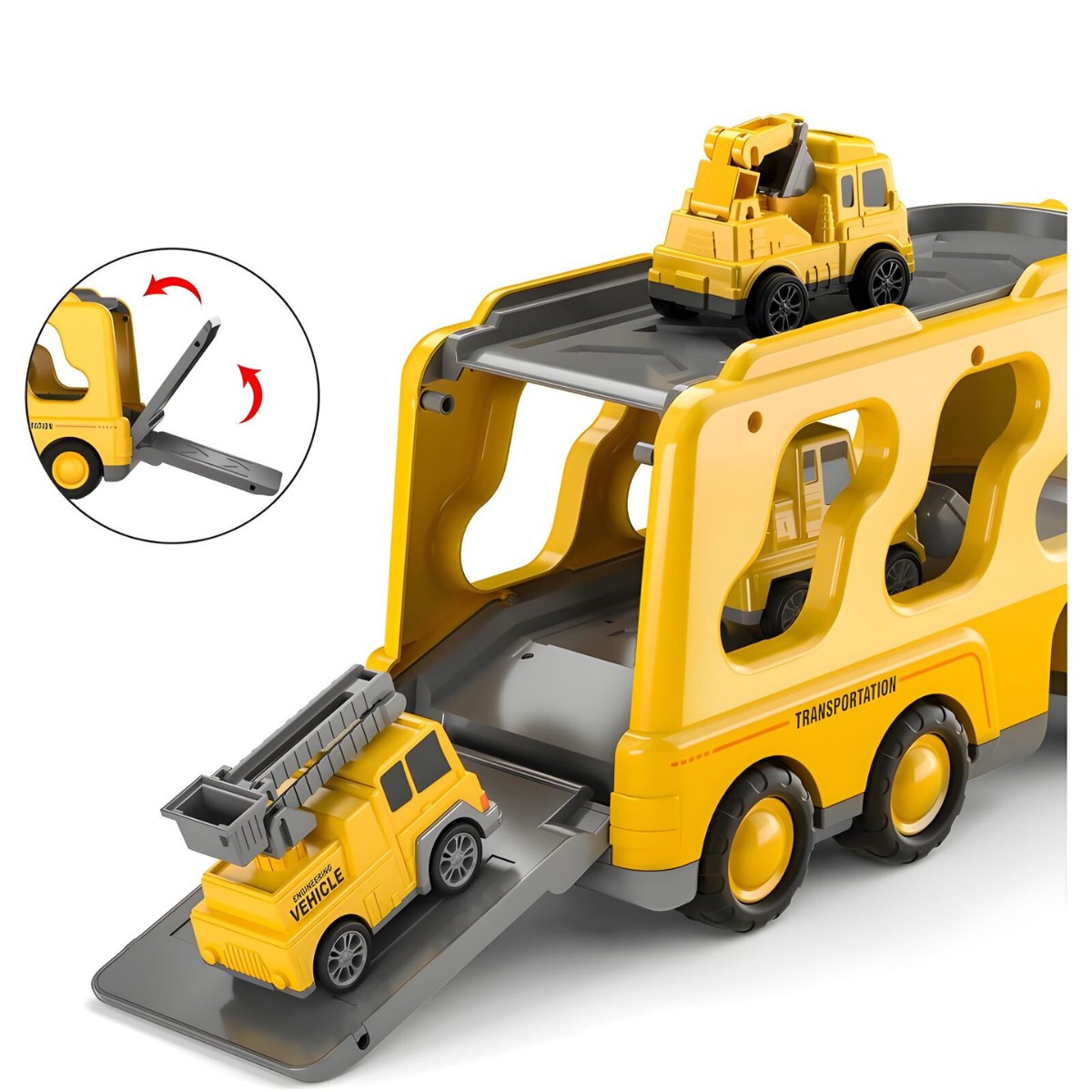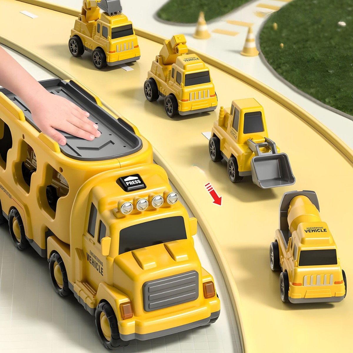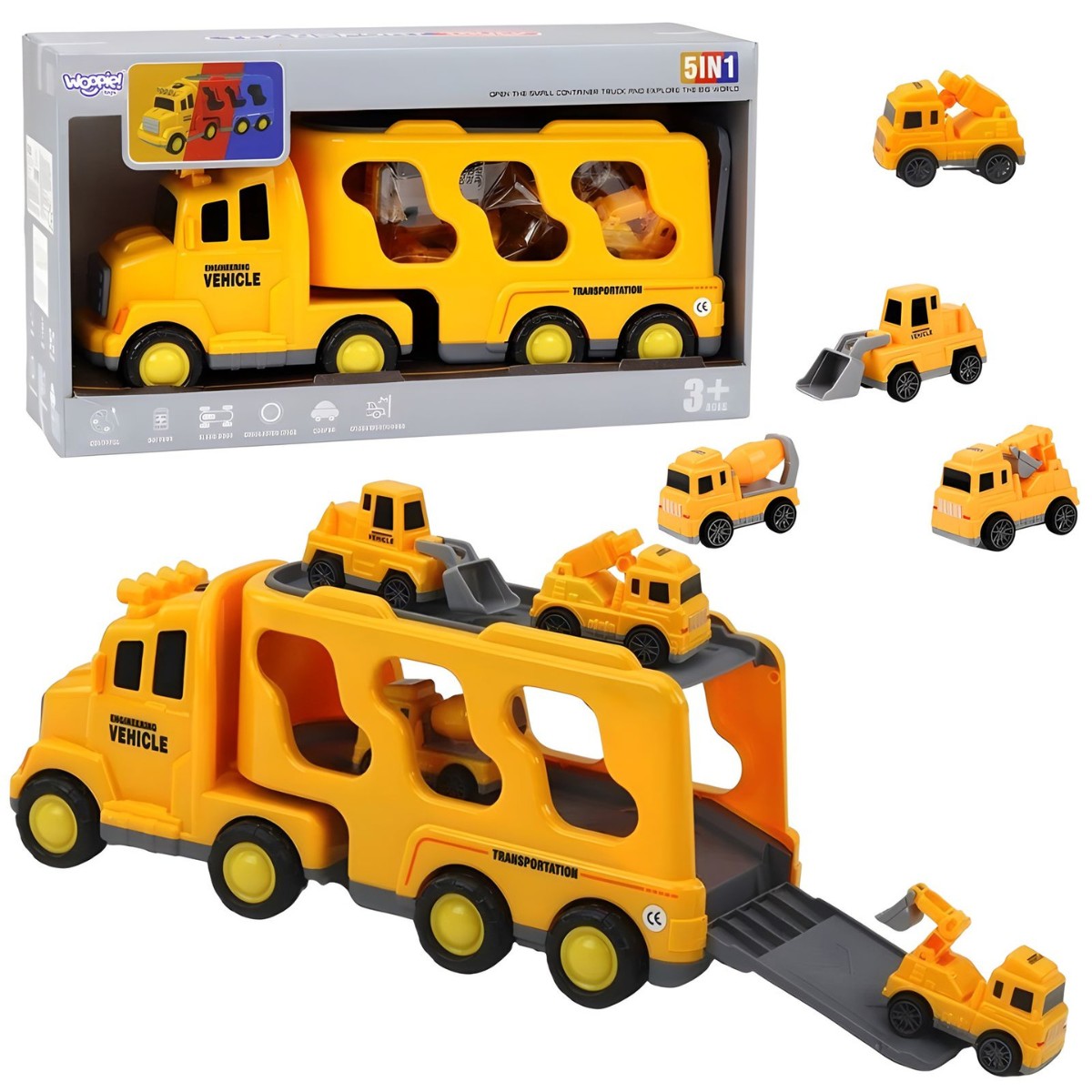 Mažesni automobiliai turi trintinį (frikcinį) variklį, todėl juda be baterijų, o tralas įtraukia šviesos ir garso efektais, suteikdamas žaidimui dar daugiau realistiškumo. Tai puiki priemonė lavinti kūrybiškumą, motoriką ir techninį smalsumą – vaikas gali kurti įvairius statybų ir gelbėjimo scenarijus tiek namuose, tiek lauke.