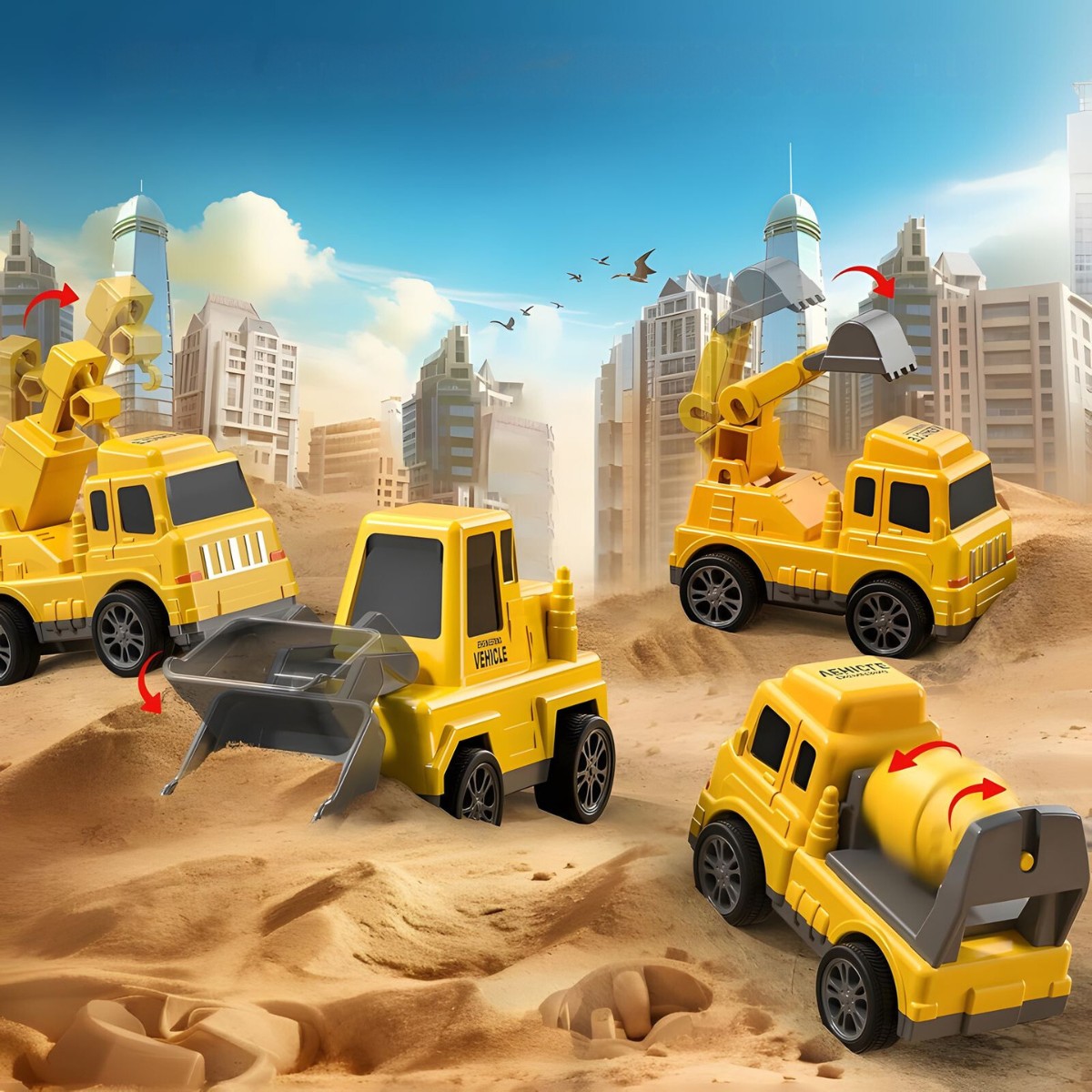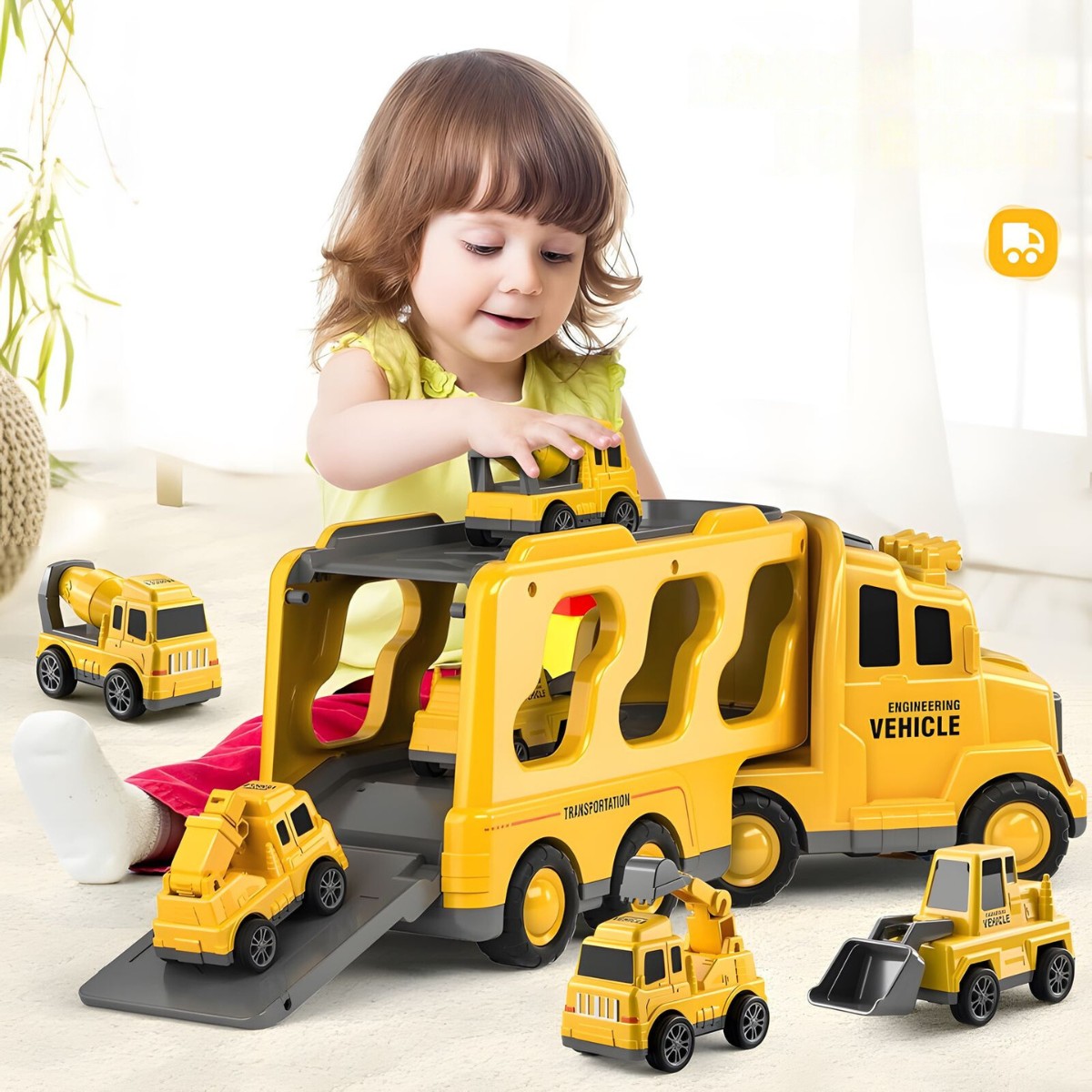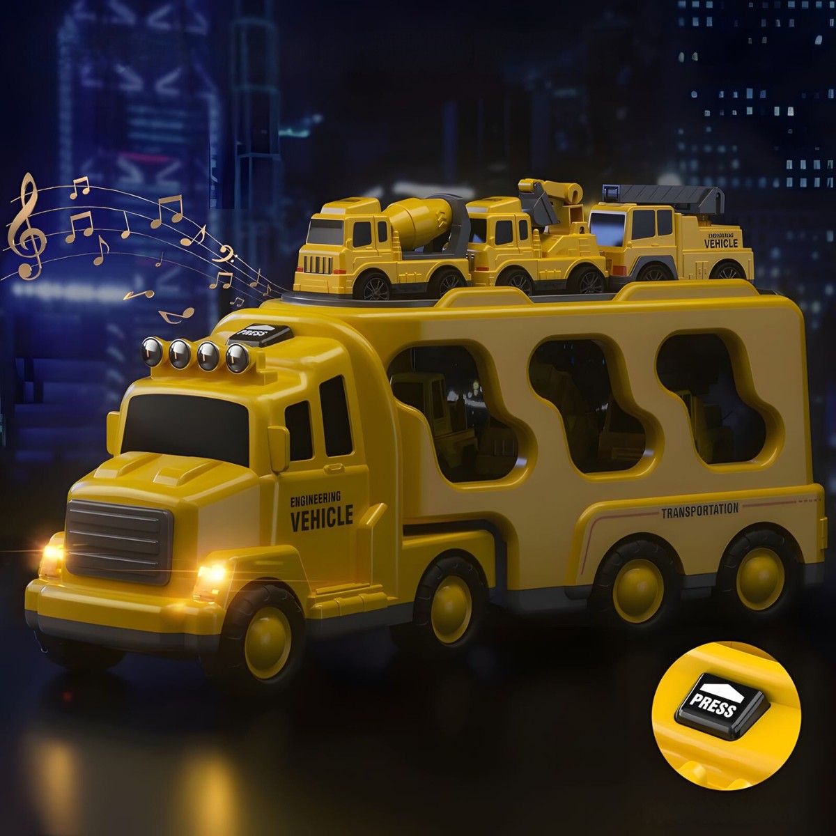 Mažesni automobiliai turi trintinį (frikcinį) variklį, todėl juda be baterijų, o tralas įtraukia šviesos ir garso efektais, suteikdamas žaidimui dar daugiau realistiškumo. Tai puiki priemonė lavinti kūrybiškumą, motoriką ir techninį smalsumą – vaikas gali kurti įvairius statybų ir gelbėjimo scenarijus tiek namuose, tiek lauke.